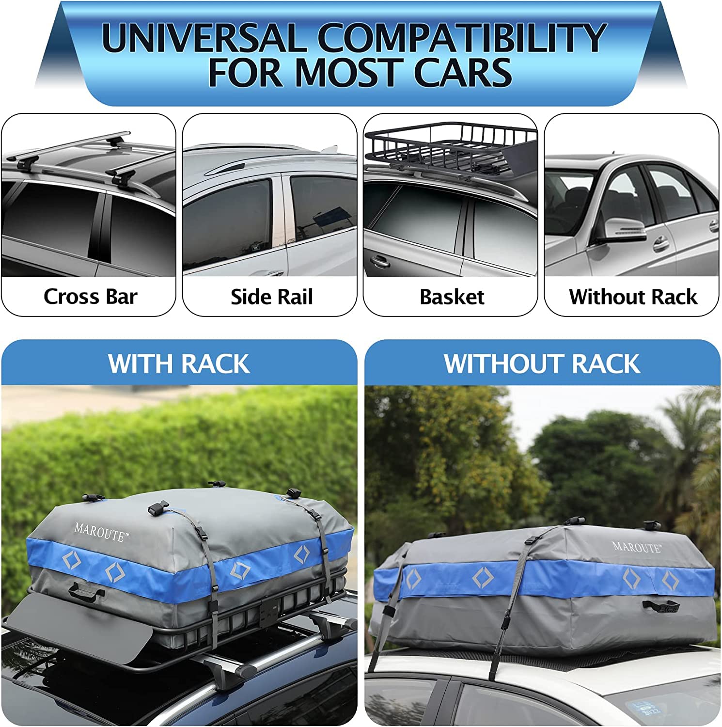 Made of heavy duty 600D PVC fabric make this car roof rooftop cargo carrier bag extra stong and durable,which can resist any weather conditions without damage.Extra waterproof:designed with waterproof material,waterproof zipper, widened waterproof flaps, waterproof straps and double reinforced seams,provides maximum waterProof protection.High security:equipped with 4 door hooks and 8 reinforced straps, offer maximum security when installing the roof cargo bag.No need to worry about any falling off situation while driving.Large Storage Space:the cargo bag can carry many staffs for a whole family,easily free up your inside vehicle space.Good partner to carry your luggage.Universal compatibility:the cargo bag can be easily fixed to any car in just a few minutes.In addition,It can be used with or without rack for all kinds of cars.Please choose the size based on personal need.