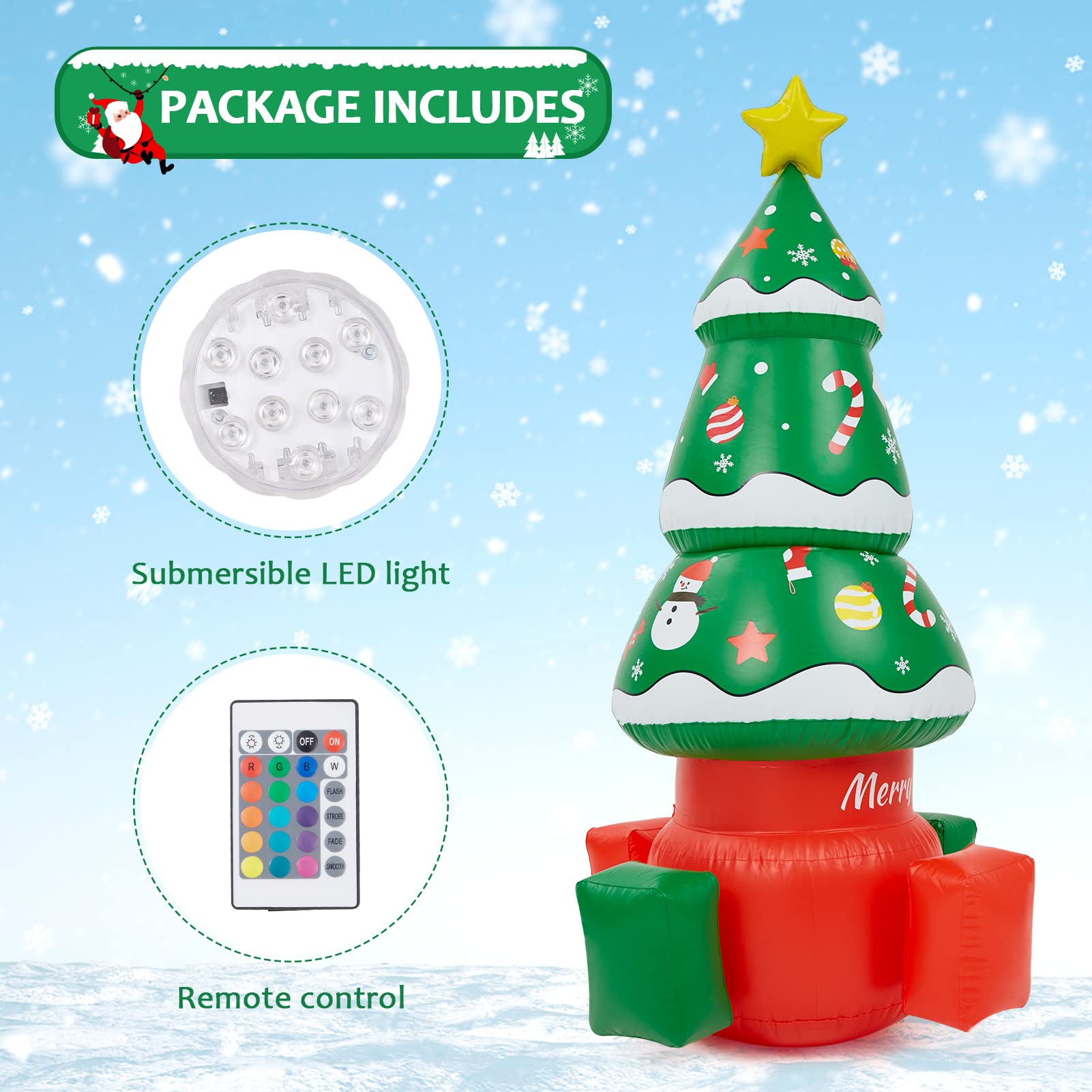 - Blow Up Christmas Tree Decorations Details: Our LED light up inflatable Christmas tree uses 16 colors remote control flash waterproof lamp, remote control *1, CR2025 battery*1, manual *1, repair sheet *2. Which will make it stand out during the hilarious festive time. it is the perfect size to stand indoors or outdoors for Christmas outdoor garden yard decorations, will delight all your neighbors and guests.
