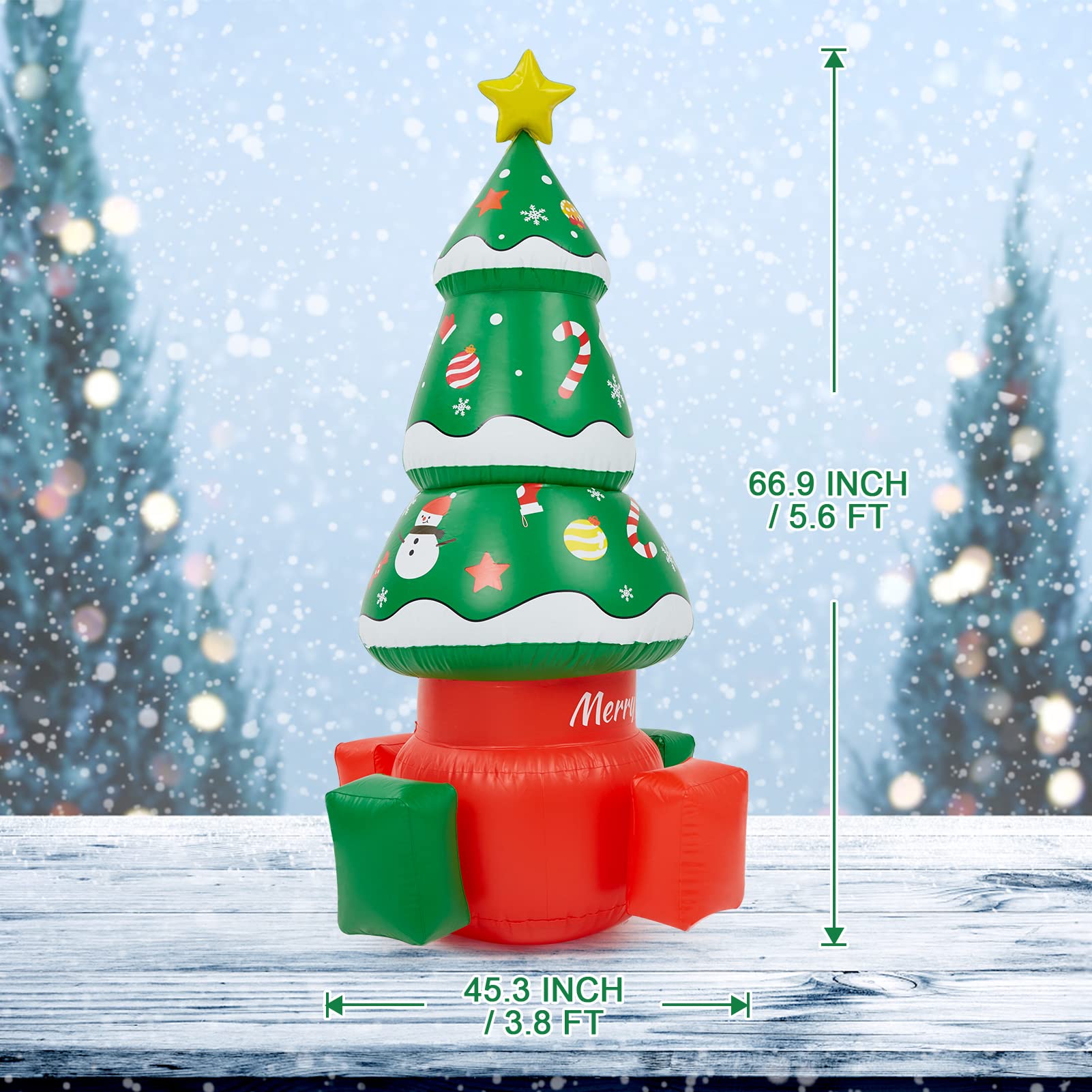 - Premium Blow Up Christmas Tree: This Christmas inflatables tree outdoor is made of 6P PVC which is waterproof, lightweight and no smell, airtight excellently for full inflation which is against rips. Our Christmas Tree measures 5.6ft in height and 3.8 ft in width.