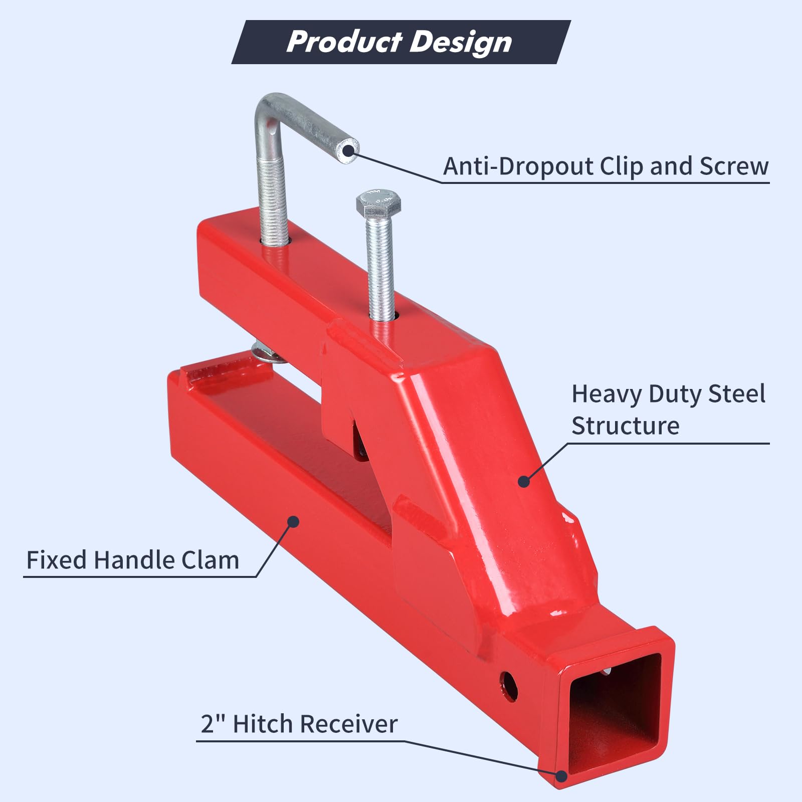 Constructed of heavy-duty steel. Rugged glossy red powder coat finish. Tractor bucket hitch fits all 2" hitch plugs.