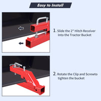 - The 2" trailer hitch receiver is designed to easily install on the front of your skid steer or tractor loader bucket.
