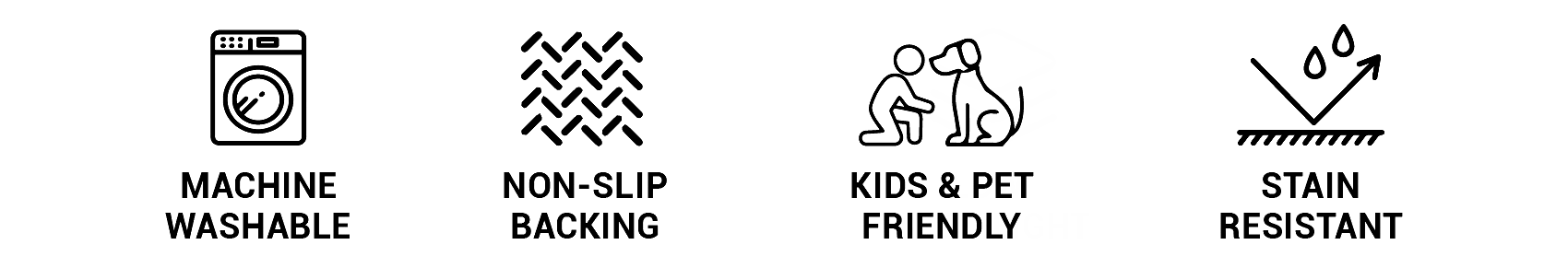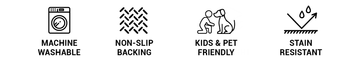 Nice and lightweight but doesn’t move around, no shedding. Use soap and water to clean any spills vs washing machine, easy to clean. No wrinkles when unpacking.