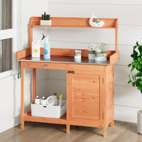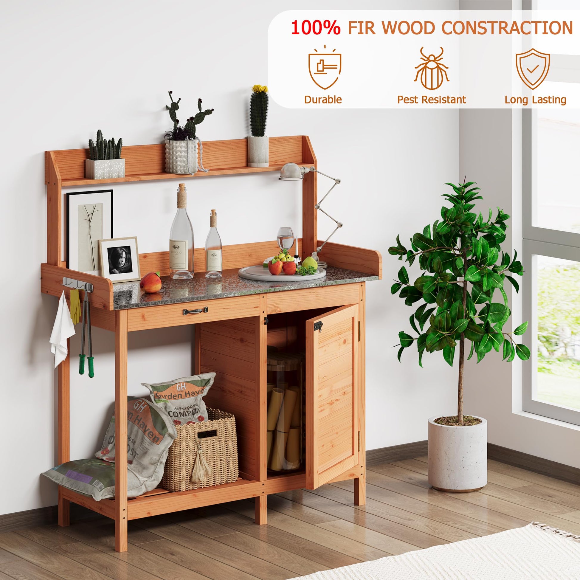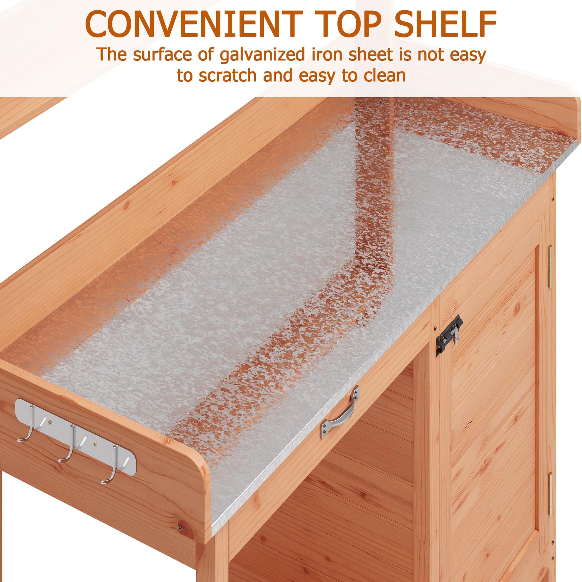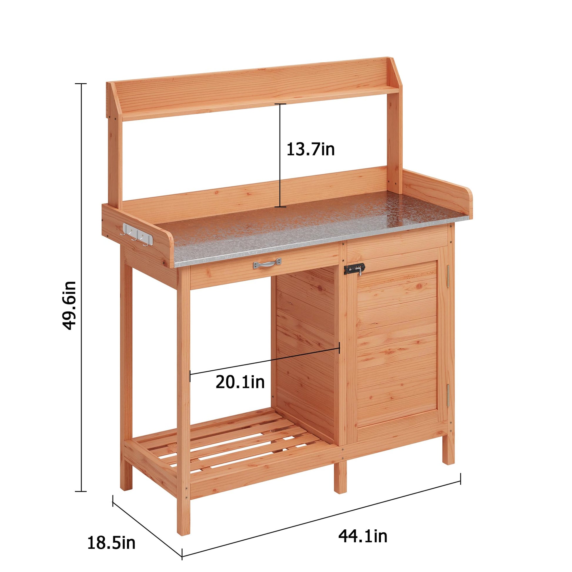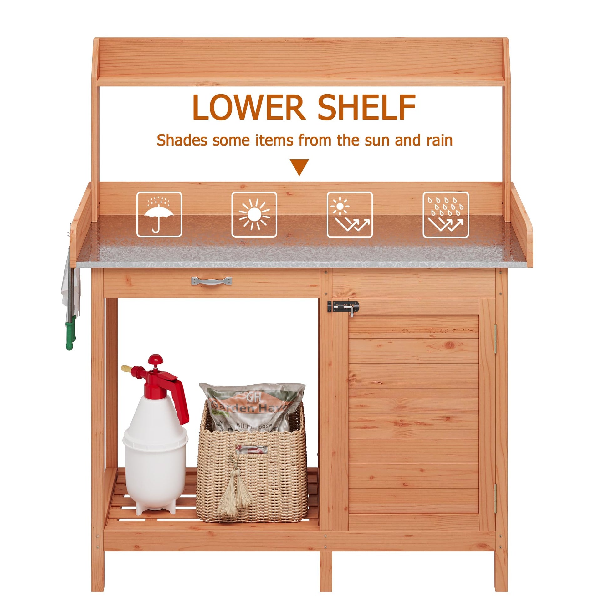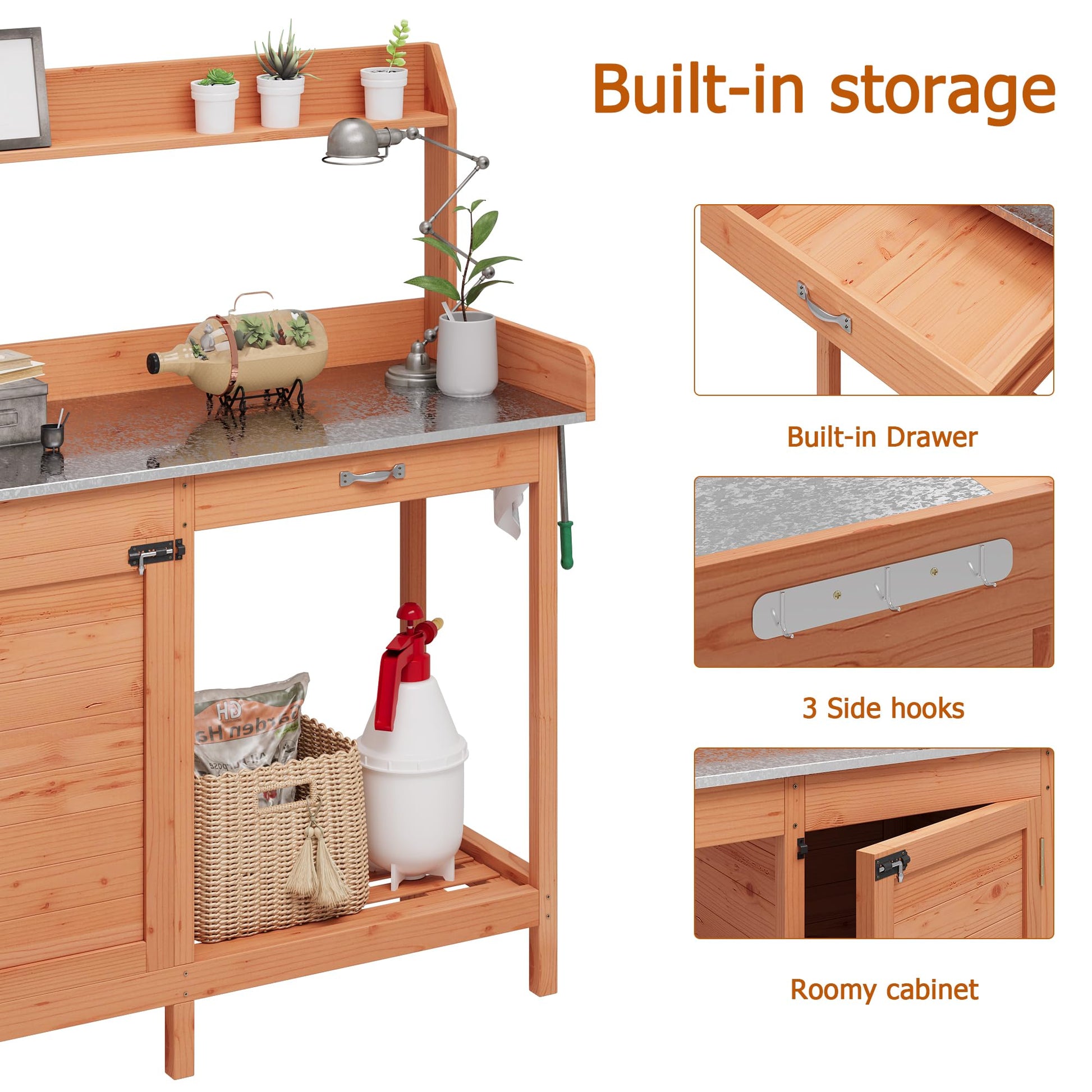 Garvee Potting Bench Table, Large Garden Outdoor Work Bench with Cabinet, Metal Tabletop, Sliding Drawer, Open Shelf for Outside(Natural Wood)