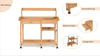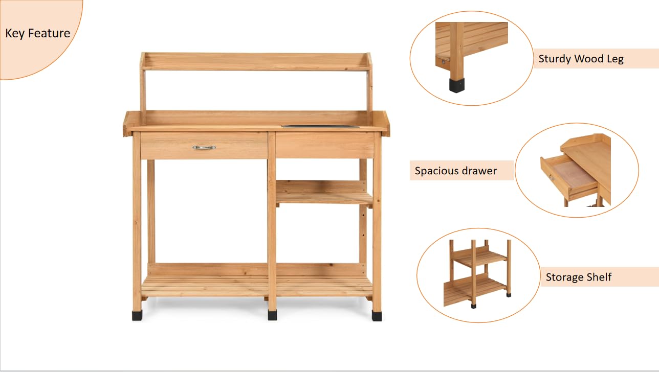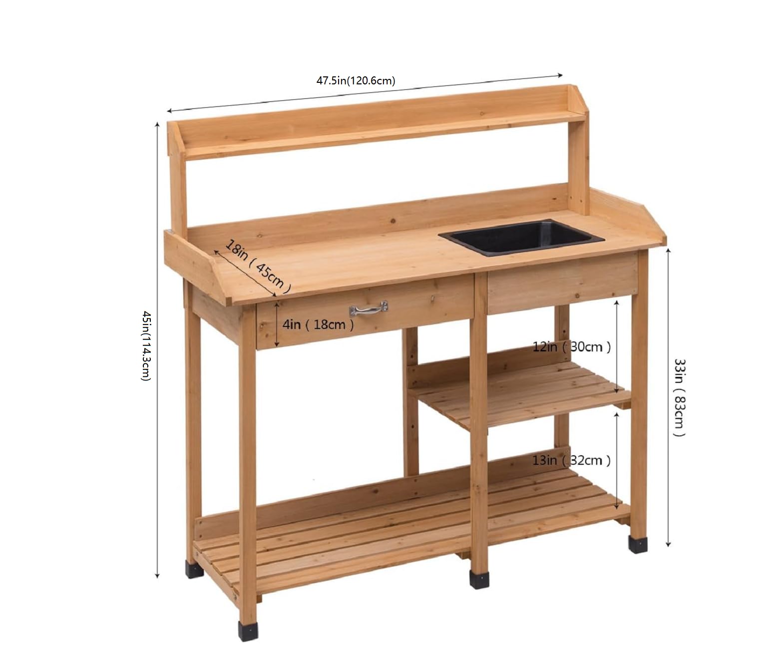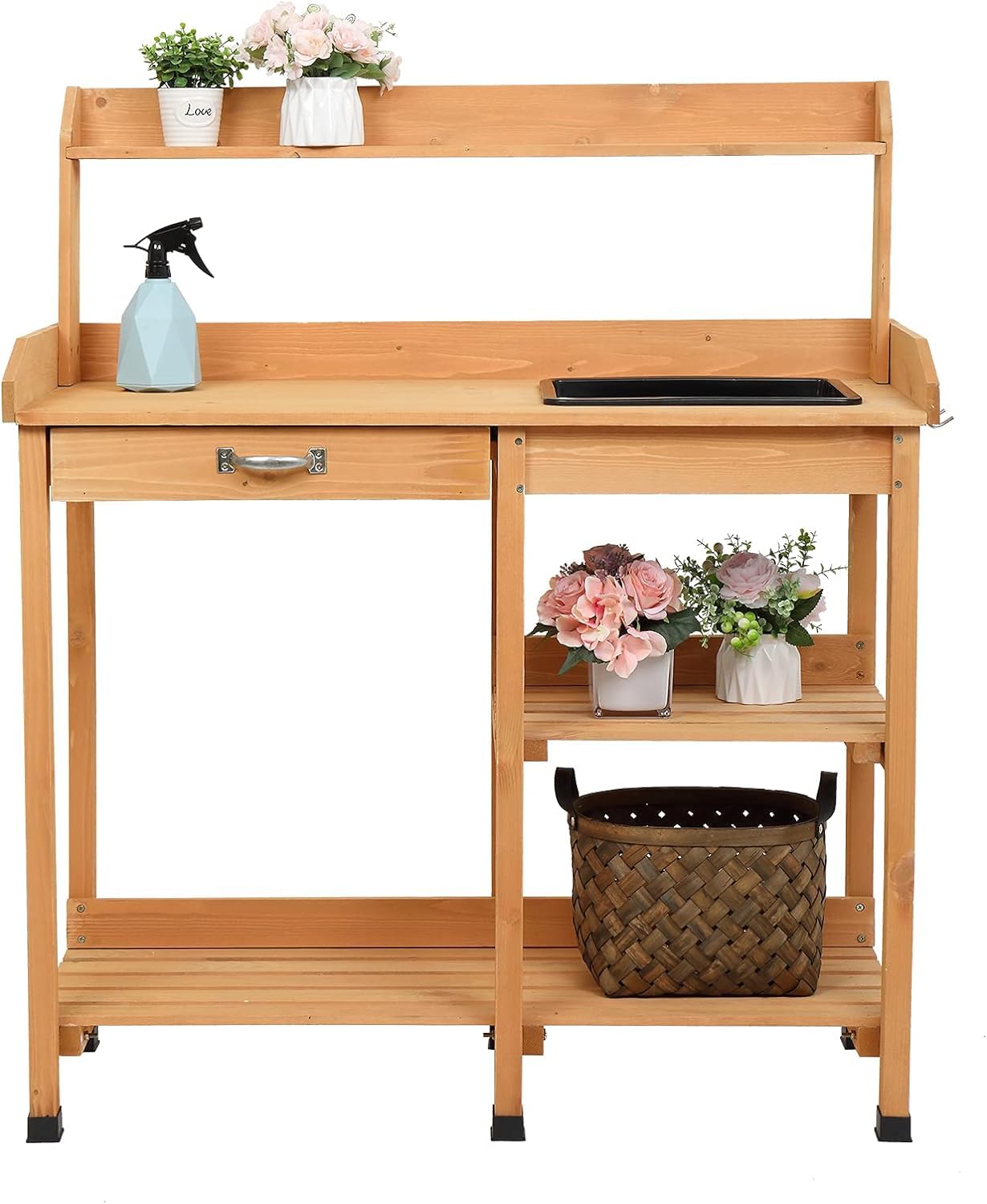 Garvee Potting Bench Outdoor Garden Potting Table, Planting Work Bench with Sink and Drawer, Solid Wood Construction, Natural Wood