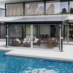 Side PC panels shield from harsh sun and light rain, creating a shaded, comfortable space for relaxing or dining. -