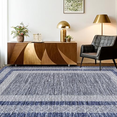 Garvee Bordered Blue 10x13 Large Washable Geometric Area Rug Non Slip Non Shedding Floor Carpet, Modern Bordered Rug, Distressed Blue Rug, Indoor Printed Rug for Living Room, Bedroom, Office