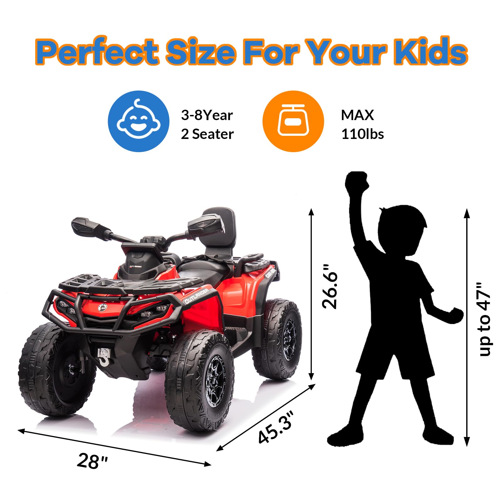 - Comfortable Seating and Versatile Tires: The ATV boasts comfortable leather seats with safety belts, making it a cozy and secure option for two young riders in this 2 seater ride on car for kids. Its 12-inch tires are designed to handle various terrains, enabling kids to explore both smooth paths and rugged surfaces during their adventures. Whether cruising in the park or navigating the backyard, this power wheels ensures a stable ride, making it an ideal choice among kids ride on toys.