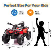 - Fully Featured: This Electric ATV Car for Kids is designed for children aged 3 and above, featuring two seats for interactive playtime. With a maximum weight capacity of 110 lbs, it’s perfect for siblings or friends to ride together! Equipped with a powerful 27V 7HZ battery and four 200W strong motors, this kids electric car offers adjustable speeds from 2-4 mph, ensuring excitement and fun during every adventure. The Bluetooth connectivity allows kids to play their favorite tunes while riding,