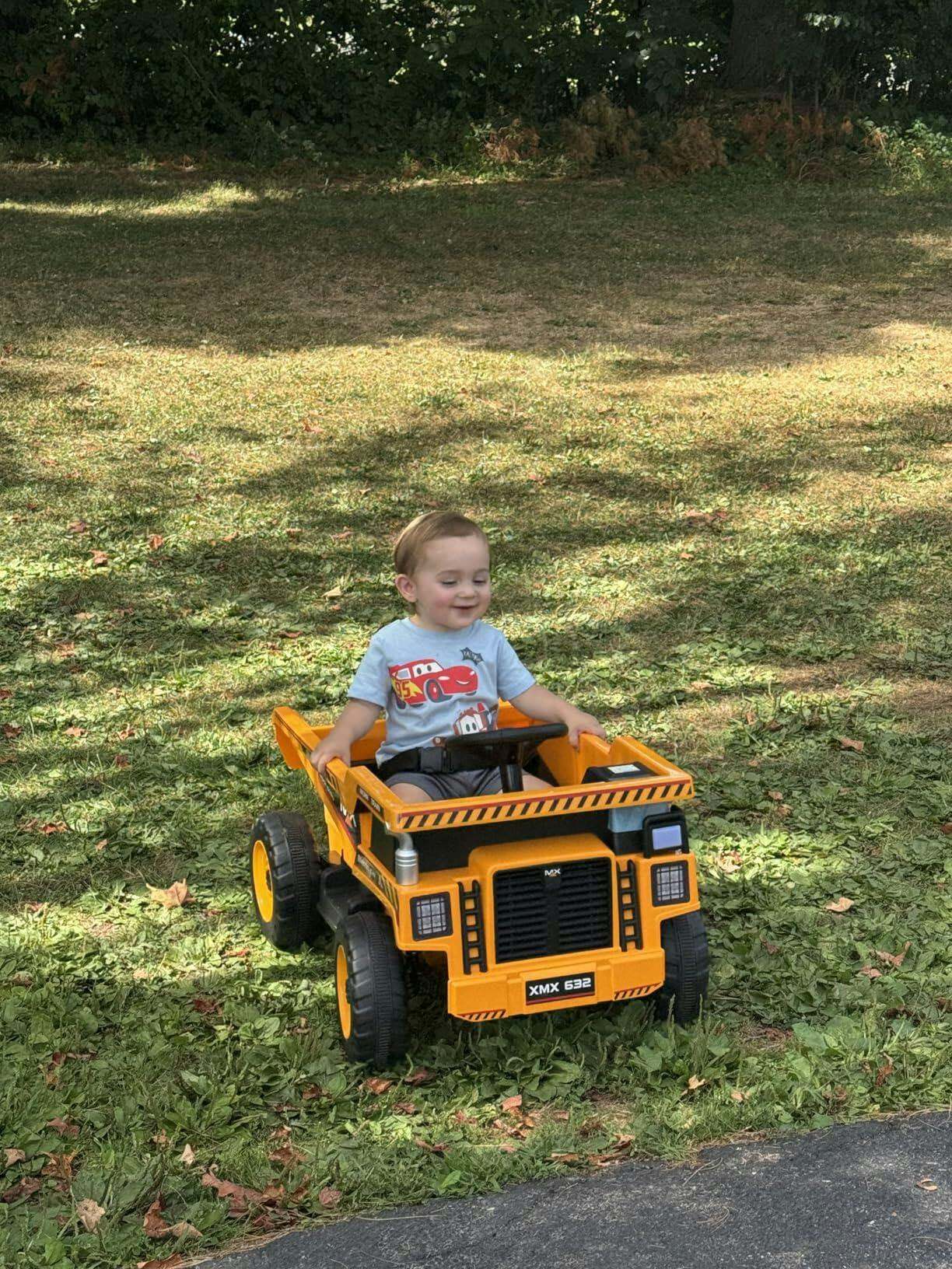 - Auto-Lifting Dump Bed & Shovel: The ride on construction vehicle features an electric dump bed that tips with joystick and pull-handle controls, plus an extra shovel for loading sand, leaves, or toys—perfect for imaginative outdoor play.