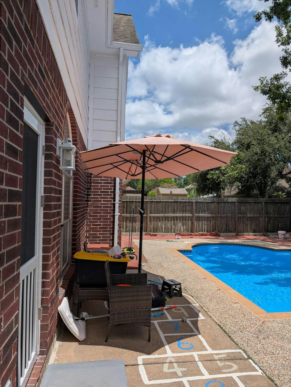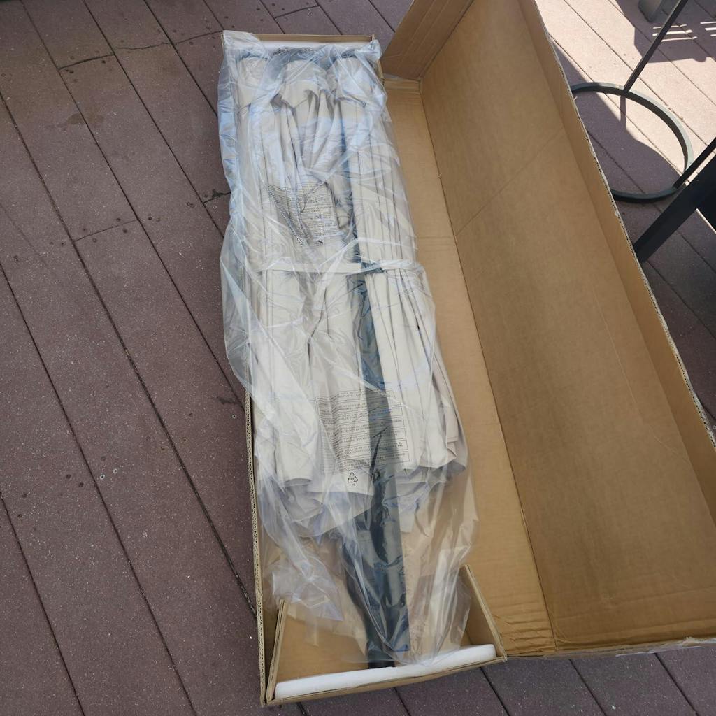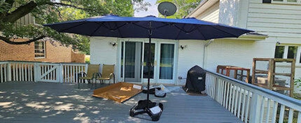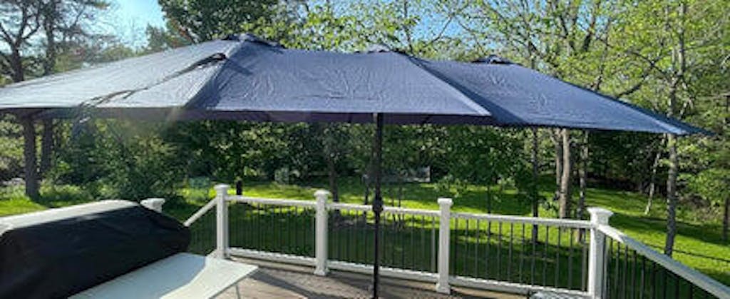Love this umbrella for our backyard deck setup shown in the photos. The navy blue fabric matches our railings perfectly, and the 13ft width easily covers our patio table, and seating area—no more scrambling for shade on sunny days. Already planning more deck nights thanks to this gem.