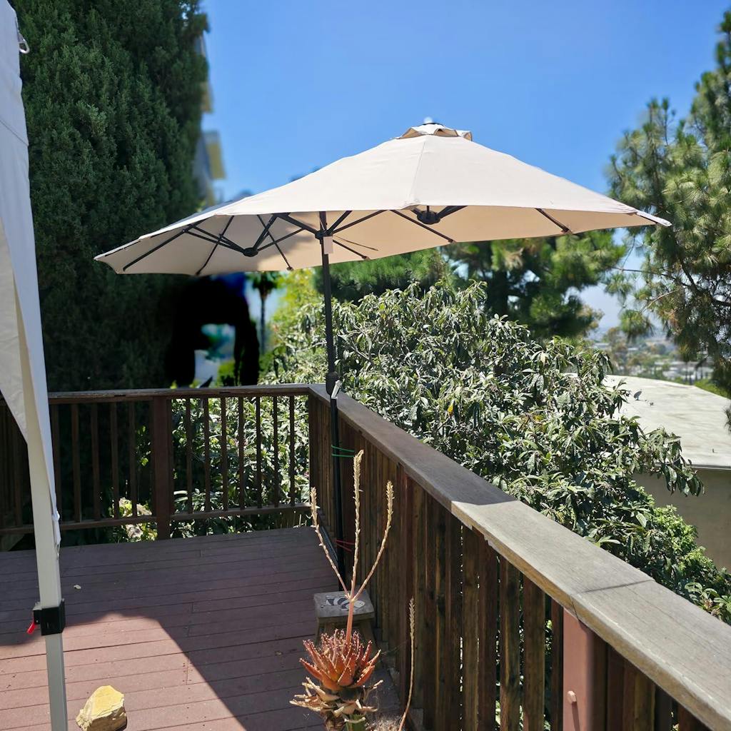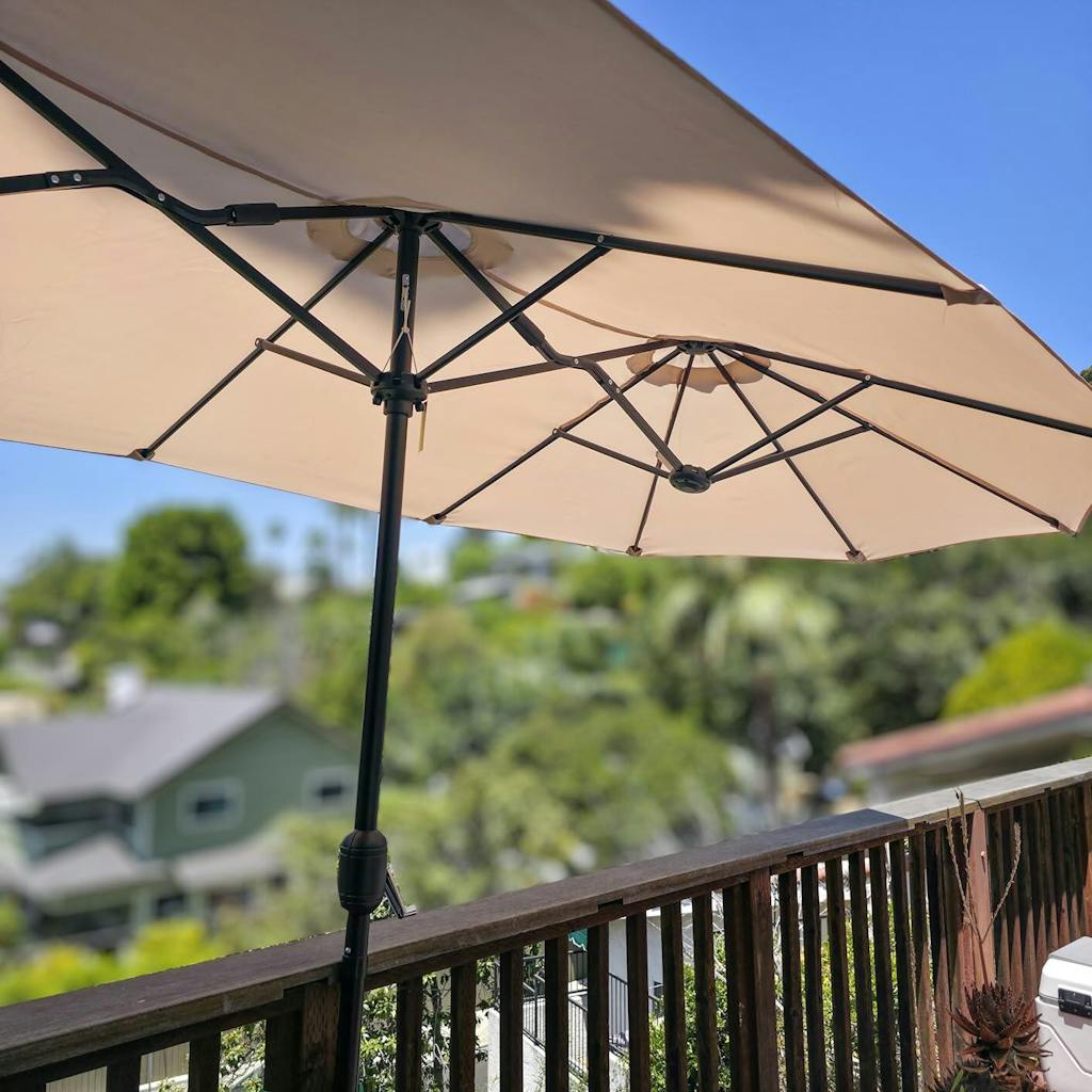 Has been a month since I deployed this GARVEE Double-Sided Umbrella and Last weekend, as temperatures climbed into the 90s, I tested this GARVEE double-sided patio umbrella on my backyard deck. From setup to shading, it delivered on every promise—here’s a closer look at how it performed. Sincerely I used bungies to secure it to the side deck after unable to find a large/heavy enough base to hold this beast "Wind".I appreciate the thoughtful engineering behind this umbrella:• Powder coated steel pole resists rust, even after sudden downpours.• 1.5" (38 mm) pole diameter and 12 reinforced steel ribs feel rock-solid, with virtually no wobble.• Snap pin system locks the canopy securely in place—no more accidental collapses when a breeze kicks up.• Light weight, I did it all by myself 😊These features give confidence that this umbrella can handle daily outdoor use without showing wear. The retiring umbrella ripped after 2 faithful years.With dimensions of 13 × 6.5 × 7.8 ft (L × W × H), this double-sided canopy creates an impressive 85 sq ft of shade. Whether I’m lounging with a book or entertaining friends at the patio table, everyone stays comfortably protected from the sun.The canopy’s premium polyester fabric stands up to sun and rain:• Waterproof coating will keep us dry during light showers.• UV protection shields skin from harsh rays.• Fade-resistant finish will maintain its vibrant color even after a week of full-sun exposure.It feels durable and easy to wipe clean, and yes, I had to wipe and wash a few times - lovely birds.Ease of UseOpening and closing the umbrella is a breeze thanks to the hand crank:1. Simply turn the crank handle clockwise to raise the canopy.2. Tighten the built-in snap pin for extra stability.3. Reverse the crank to lower—no wrestling or awkward reach required.This smooth mechanism makes daily use hassle-free.I’ve set this umbrella up in various spots:• Patio dining area for afternoon lunches• Poolside lounge to keep cool between swims• Thinking about a beach pop-up shelter for weekend trip, humm… maybe not.Its size and sturdiness make it versatile—perfect for homes, cafes, restaurants, and even rental setups I would think.Likes:• Wide, double-sided canopy provides extensive shade• Solid powder-coated steel frame resists rust• Hand crank makes deployment effortless• High-quality polyester fabric is waterproof and fade resistant• Snap pin secures canopy, reducing wobbleCons:• Large footprint requires a hefty base or weighted standIf you’re looking to upgrade your outdoor oasis with dependable, generous shade, this double-sided umbrella is a winning pick. It combines durable construction, excellent sun protection, and user-friendly operation—all at a price that delivers solid value for money.