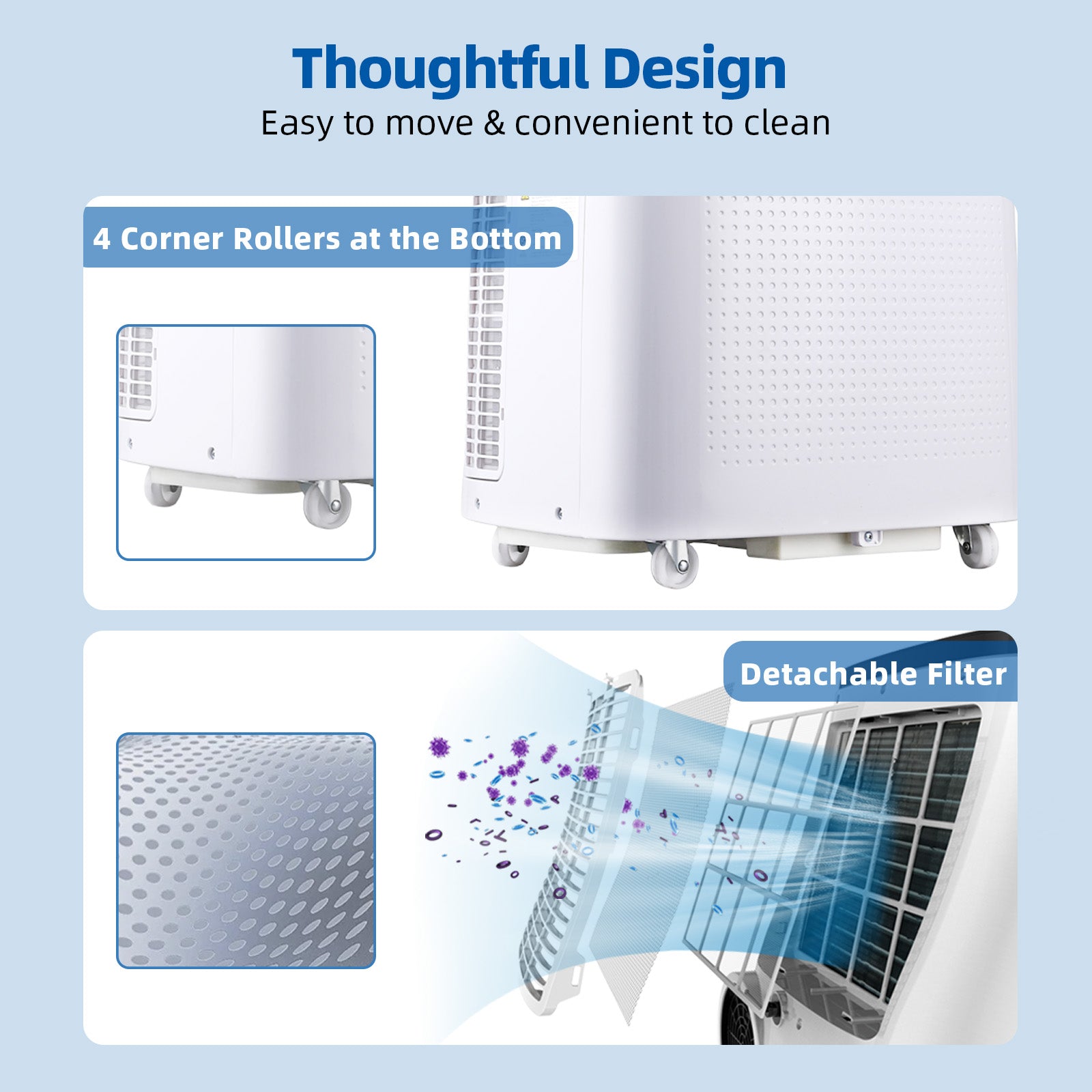 • One portable air conditioner for multiple functions, helping you save space and money while enjoying a comfortable indoor environment and temperature in summer.