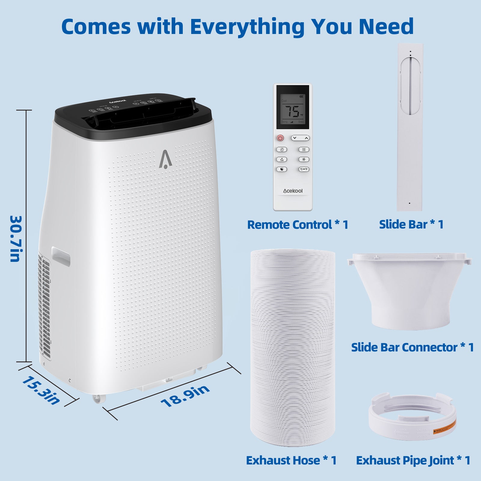 • The room AC unit included: AC unit, remote control, installation kit, exhaust hose, drainage pipe, user Manual