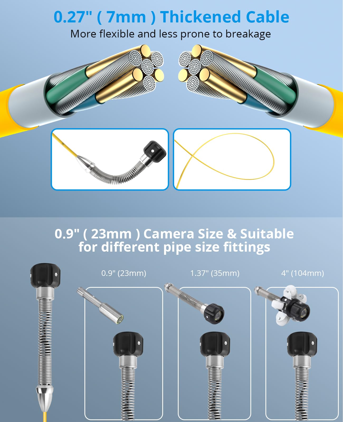 Our drain camera features a self-leveling camera head that keeps the screen image always in the right orientation. This ensures excellent visibility regardless of the pipe's twists and turns, making your inspections easier and more accurate.