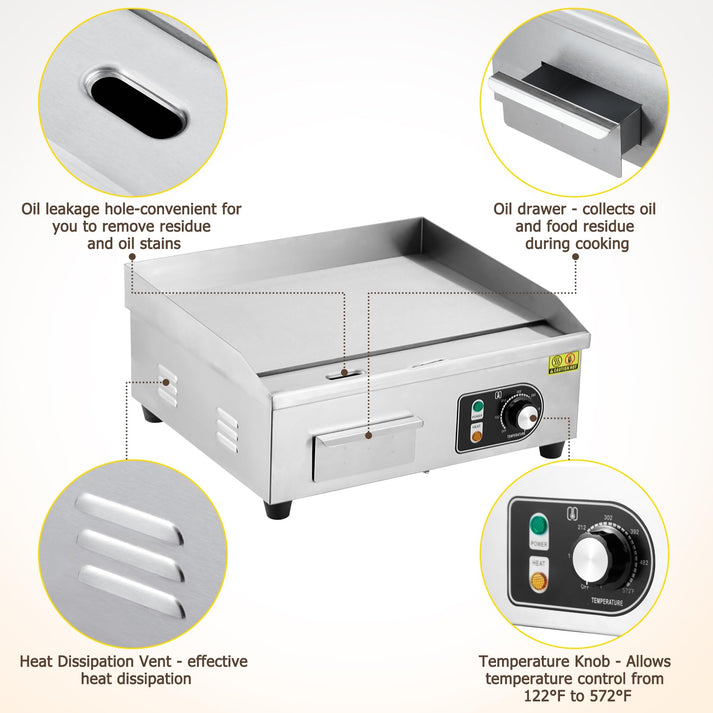 Garvee 18-Inch Commercial Electric Grill 1600 Watts Non-Stick Stainless Steel Adjustable Temp 122°F-572°F for Home & Restaurant