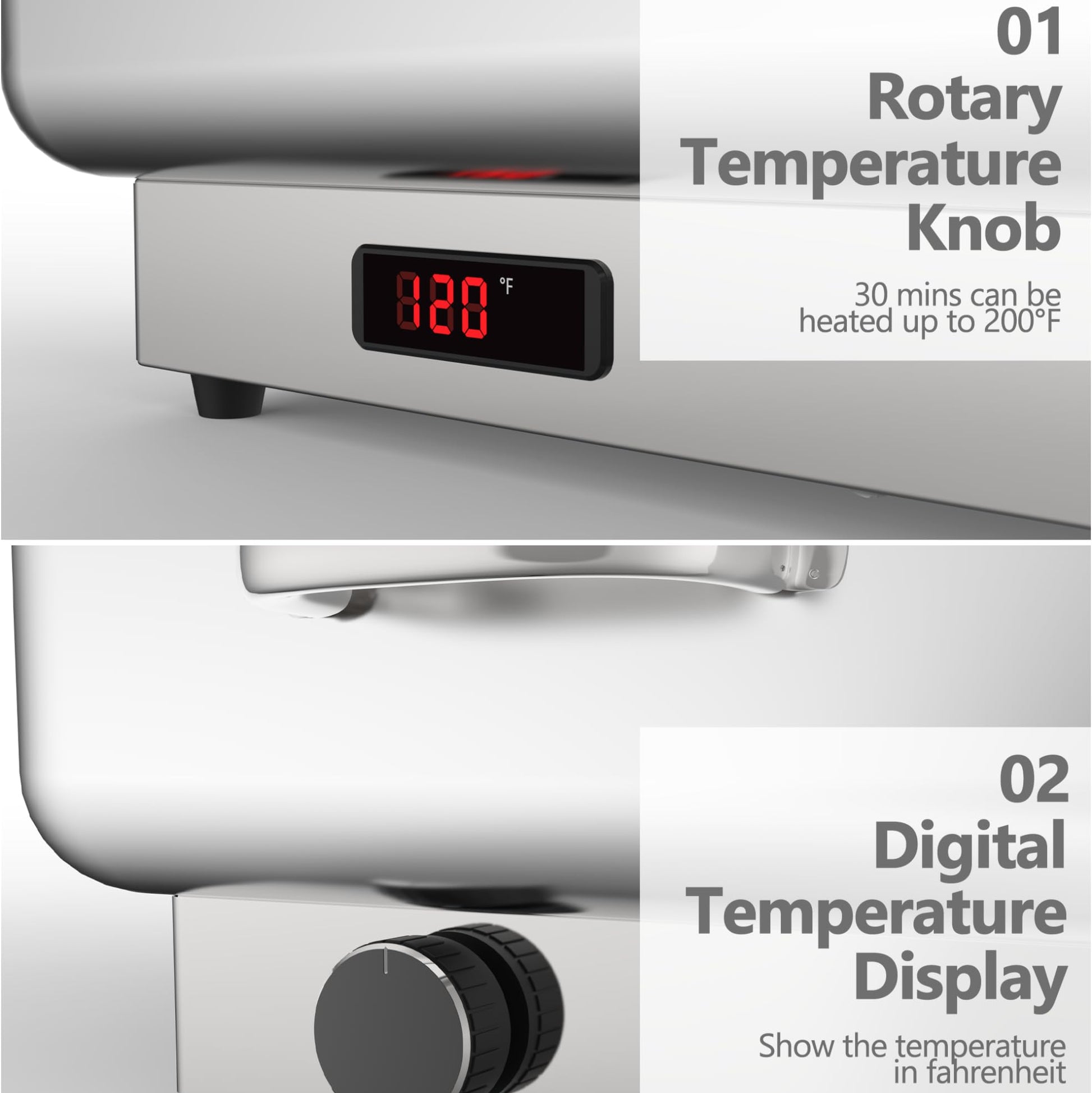 • 【Adjustable Temperature Control】The electric buffet servers and warmers have a digital control panel and temperature display, so you can easily read and adjust the temperature. Great for keeping food at the perfect serving temperature. The stainless steel chafing dish can adjust the temperature from 86°F and 200°F(30°C and 93°C) to keep food warm.