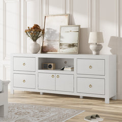 Garvee Farmhouse TV Stand for 75/80 Inch TVs, Long Entertainment Center with 6 Storage Drawers & Soundbar Shelf, White Television Consoles Stands for Living Room, Bedroom