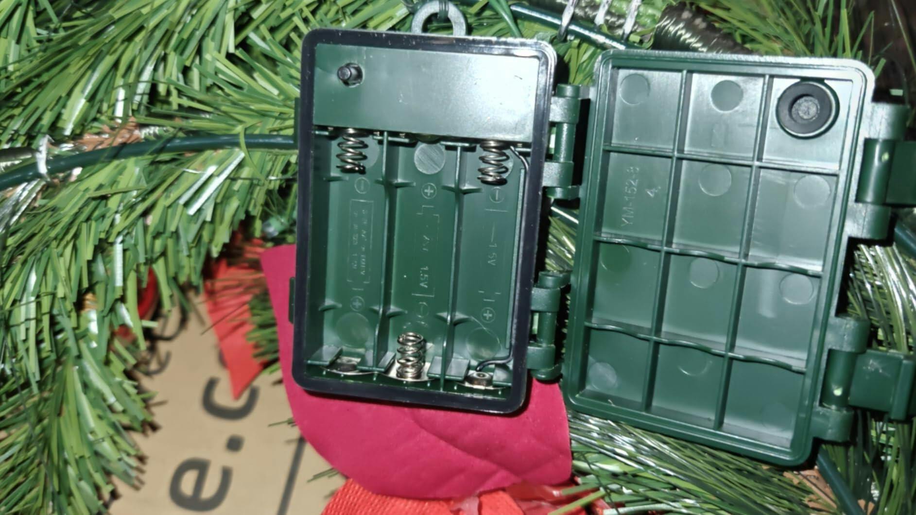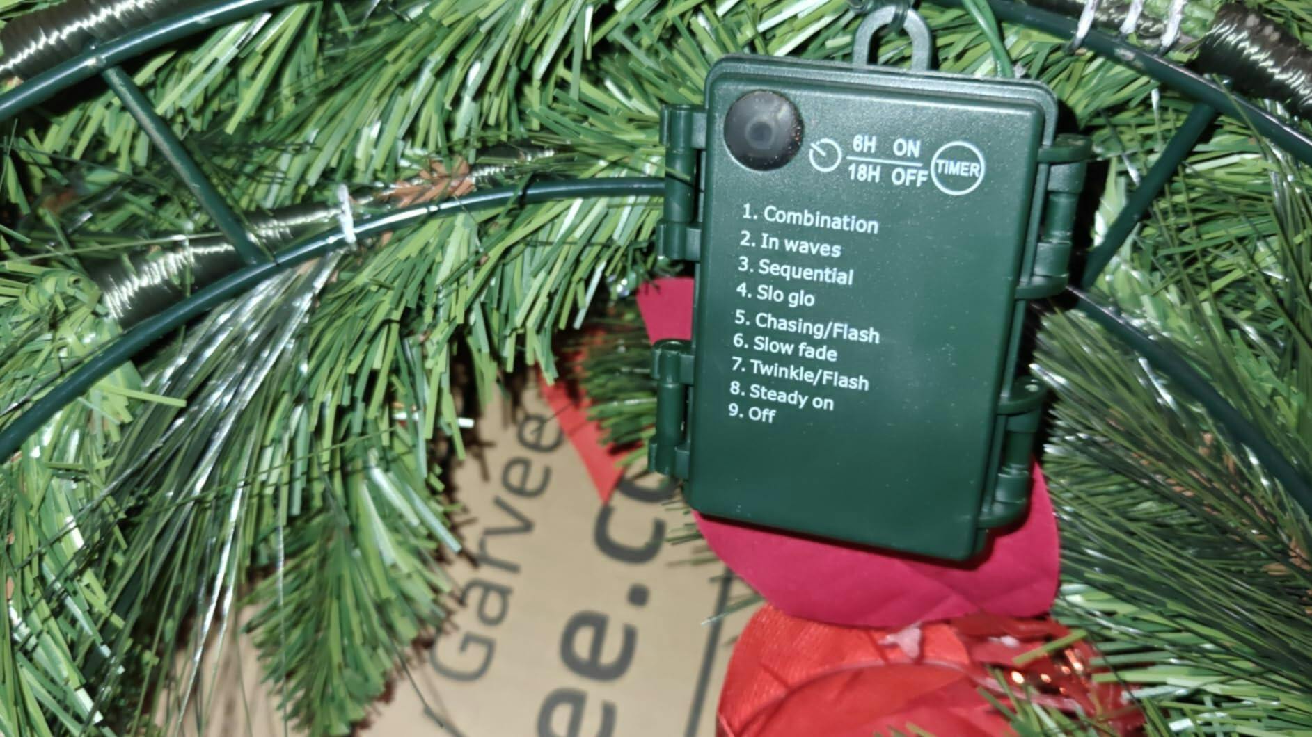 This is one beautiful and festive wreath! The flowers look real, the LED lights are fantastic and the greenery is green! One of the coolest features is that you can choose different light pattern options including one that does them all! It runs on three AA batteries and is easy to hang. This is an absolutely festive wreath for the holidays!