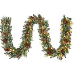This garland impressed me immediately. It's full, shapable, and has a realistic look that you often don't find at this price (currently $37.99). My photos are right out of the box, without any fluffing. I own a similar flocked garland that cost more than twice as much, and this one is equal in style, realism, and quality.The pine cones on this strand are real, which I appreciate, even though mine has dropped quite a few seeds. It adds to the natural look and feel. The lights have a warm glow and eight different settings. It requires (3) AA batteries (not included), so it can be placed anywhere without having to worry about an outlet.Overall, this garland is beautiful, lush, and a great value. I looks high-end and is well made. I like it so much, I already ordered a second one.