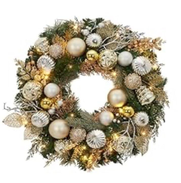 Garvee 24 In Christmas Wreath With Lights for Front Door, Pre-Lit Christmas Wreath, Battery Operated, Lighted Xmas Door Wreath with Ball Ornaments for Christmas Door Fireplace Decor, Gold & Silver