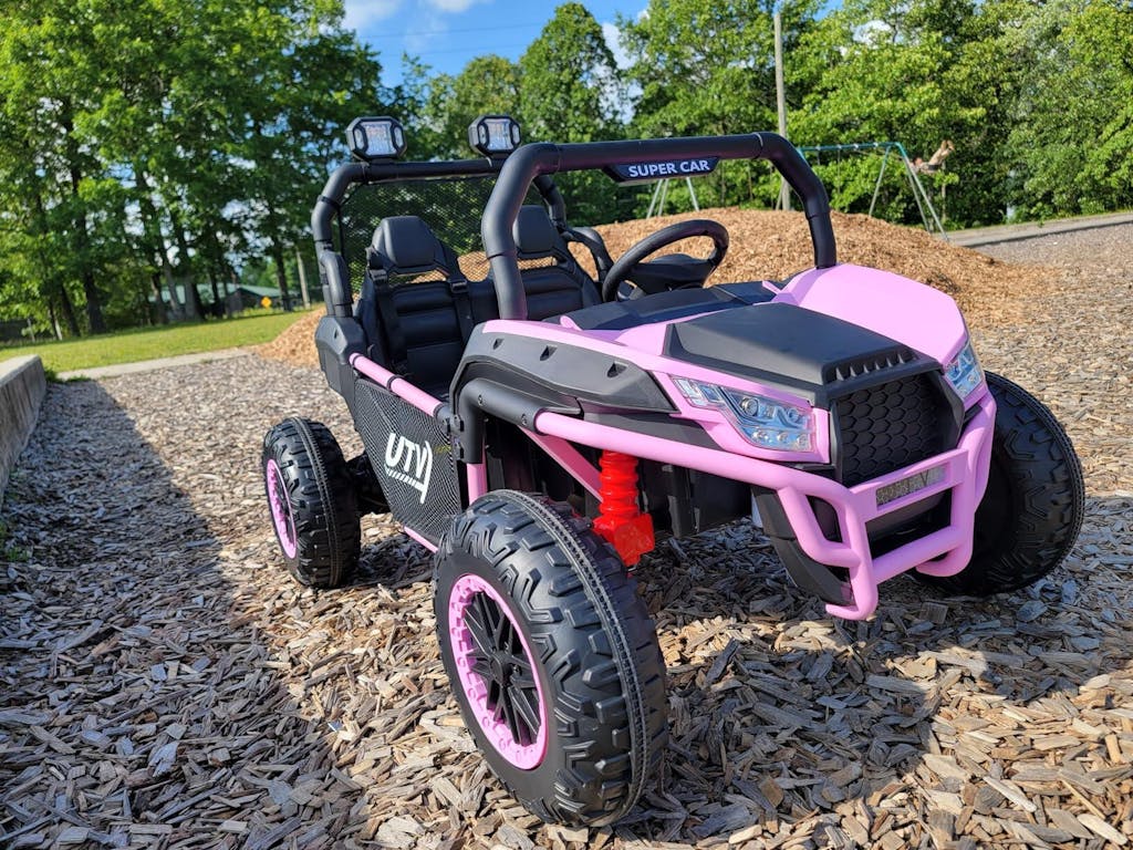 - Real 2 Seater UTV:This XXXL UTV is equipped with a 20-inch wide seat. It is a true two-seater electric vehicle for children. Both seats are equipped with seat belts to ensure safety. It is wide enough for your two children to drive and play.