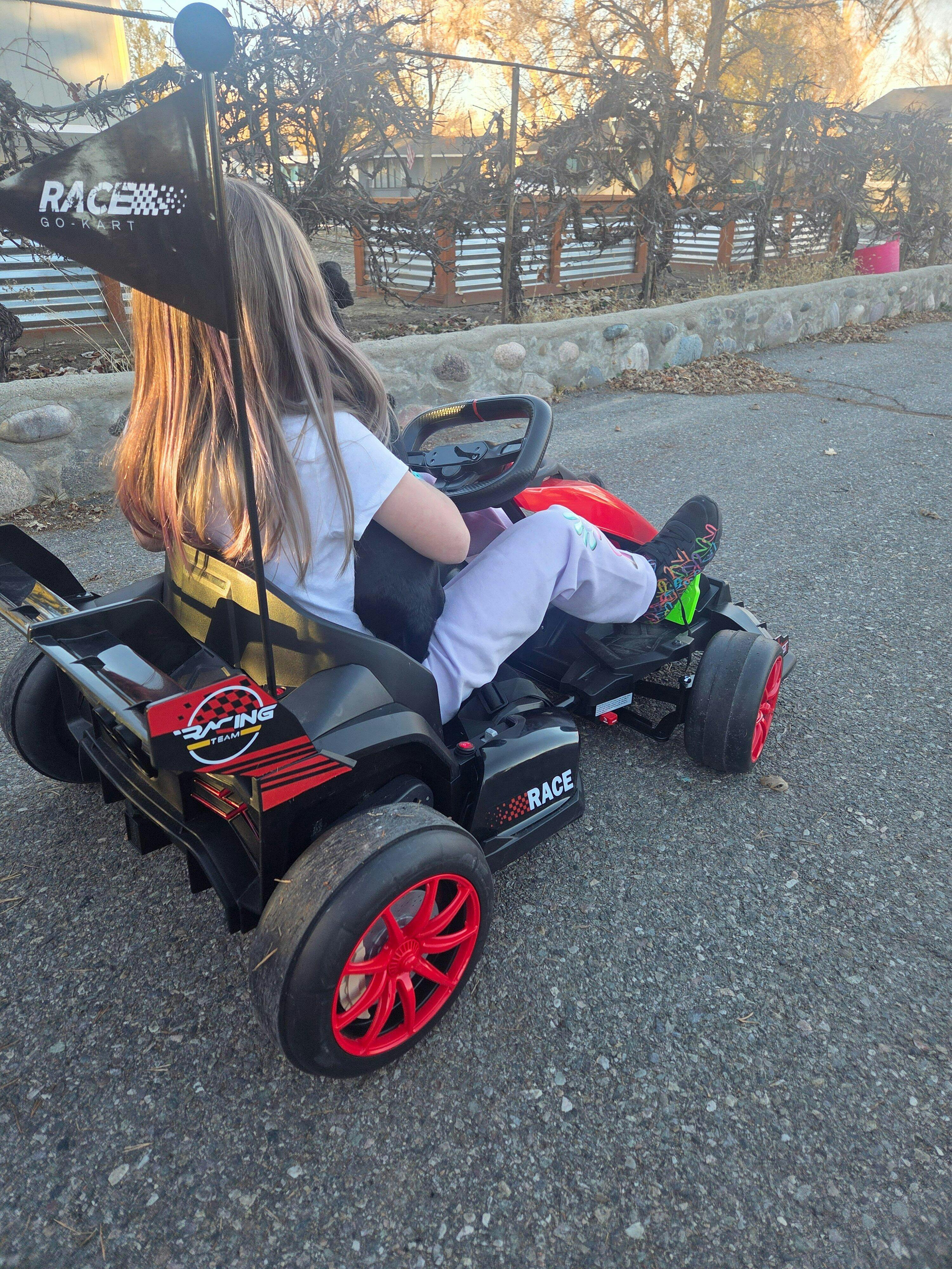 - 【 Drifting Experience】24V 300W motor delivers 7.5MPH racing speed with precision-controlled drifting function. Four EVA silent wheels ensure smooth outdoor adventures while PP foam tires eliminate flat tires - perfect for backyard racing & driveway adventures.