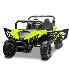 - Off-Road Adventure - Experience realistic UTV action with bright LED headlights, Bluetooth music player, and rugged puncture-resistant tires. The four shock absorbers and dual-lock doors provide a smooth, safe ride on any terrain, from backyard grass to sidewalk adventures.