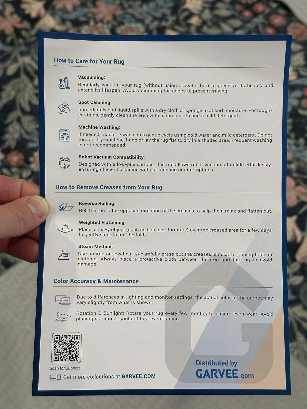 - Package & Care Tips: Your new rug arrives in space-saving folded packaging, and any creases from transit will relax naturally over a few days. For a quicker result, you may use a steam iron on a low-heat setting. Please be aware that colors might appear slightly lighter or darker from different angles, and due to limitations in digital displays, there may be slight variations from screen to screen. We always recommend measuring your space carefully to ensure the perfect fit. We kindly advise rev