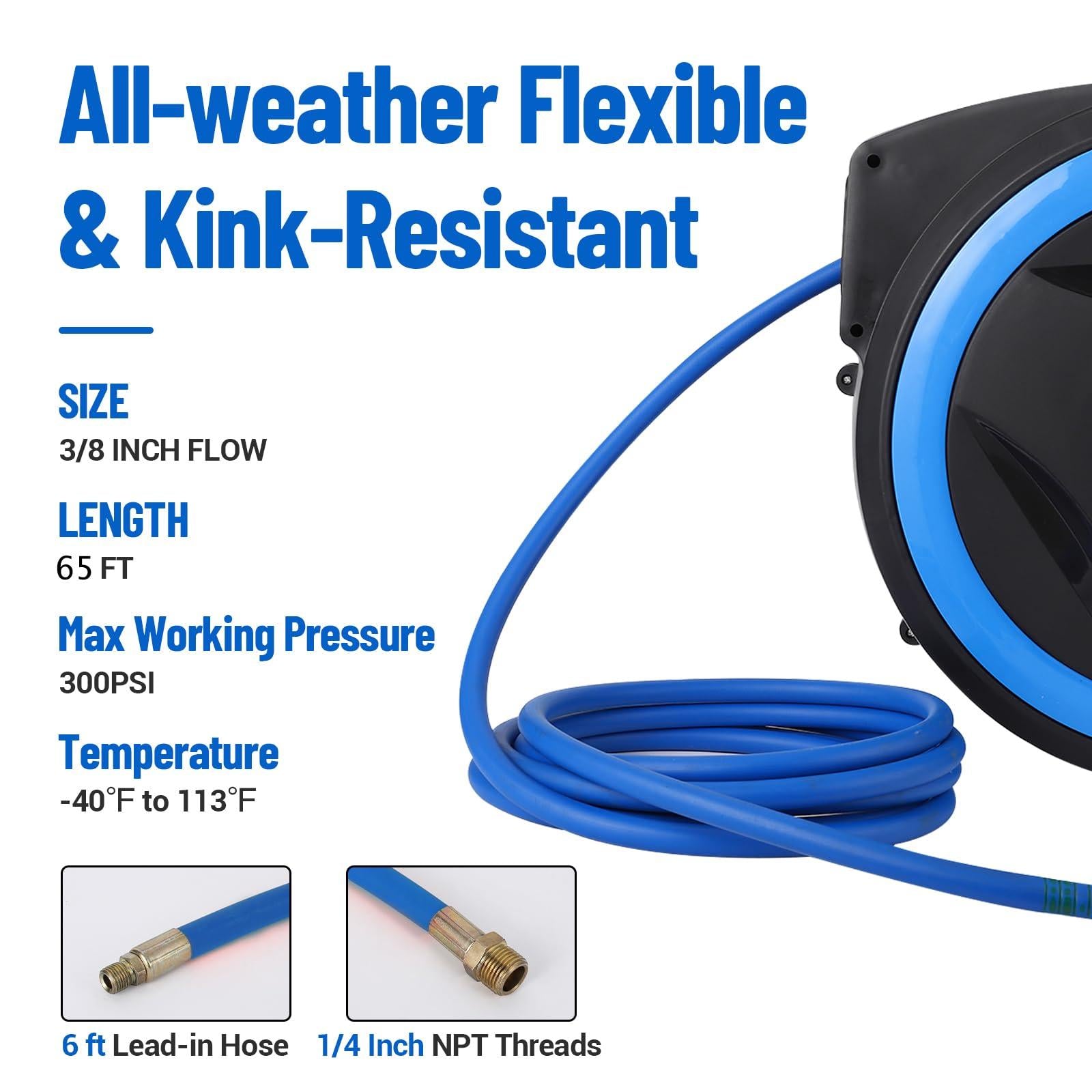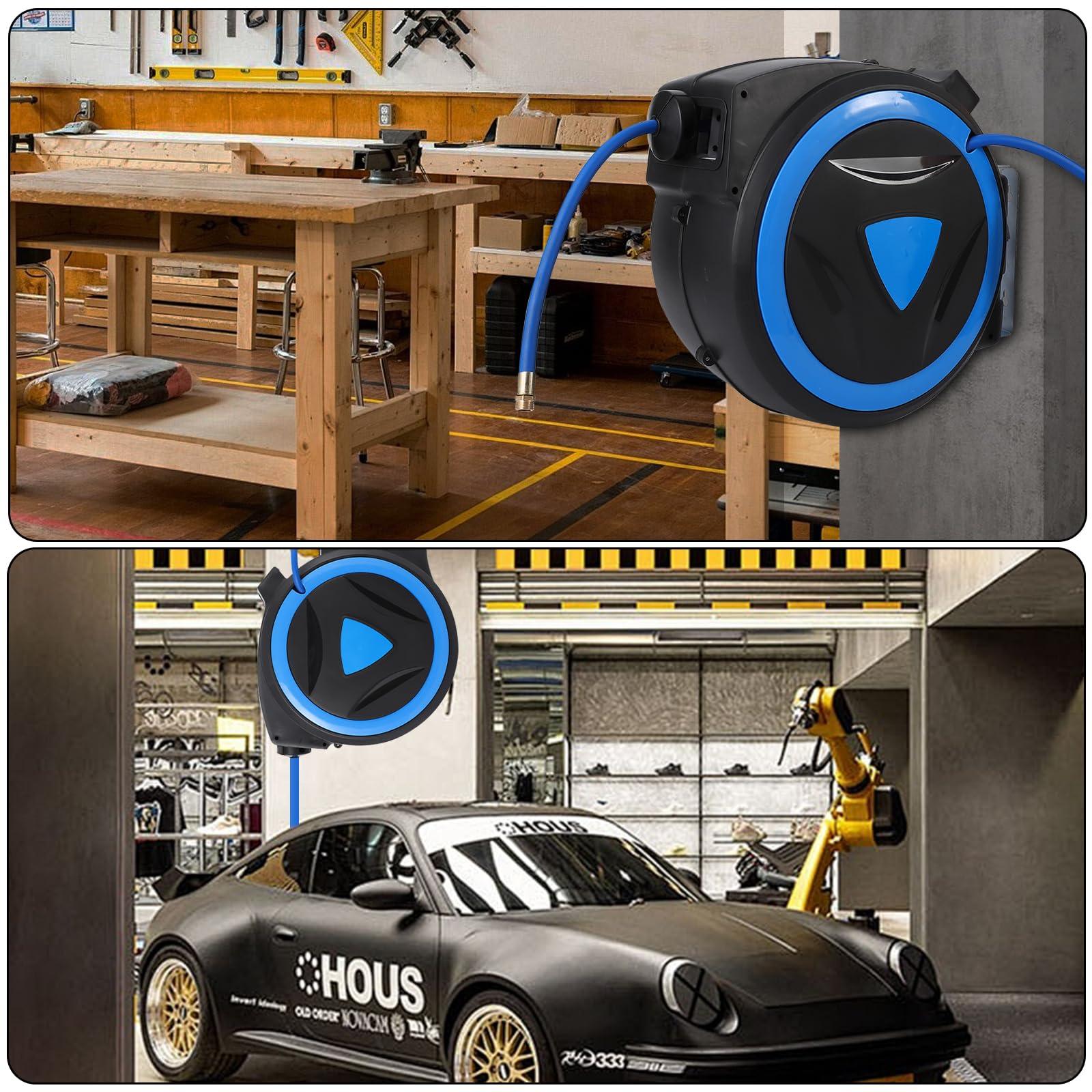 Garvee 3/8” 65FT Retractable Air Hose Reel – Auto-Lock, 180° Swivel Bracket & Tangle-Free Retraction for Garage/Workshop, Blue