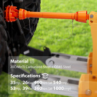 - 【Adjustable Length and Power】: The tiller PTO shaft is designed with a telescoping steel tube, universal joint, and yokes, offering compressed and extended lengths of 31.5" and 41". It provides 35 Hp, 26 Kw, and 460 Nm torque at 540 rpm, and 53 Hp, 39 Kw, and 360 Nm torque at 1000 rpm, allowing for differential speeds of the PTO driveline shaft.