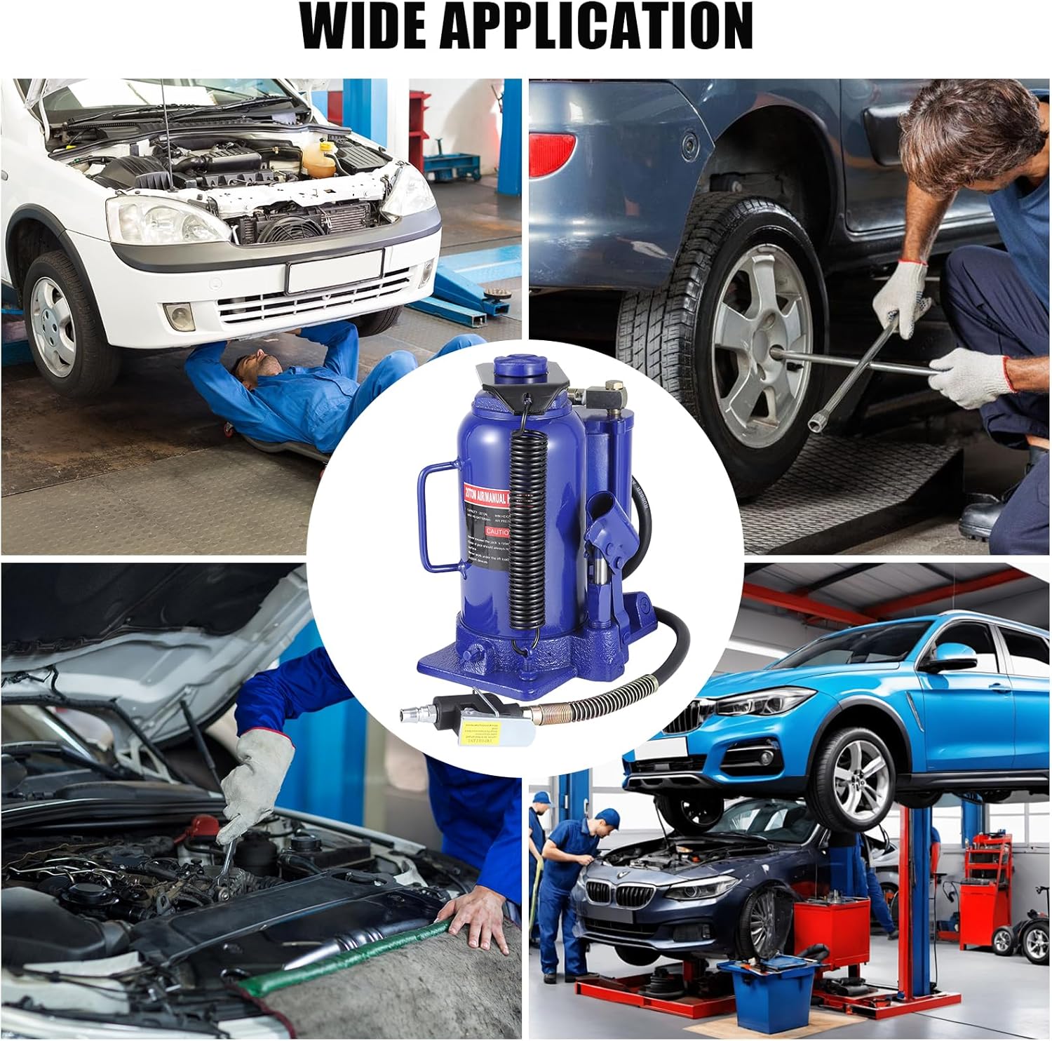 - WIDE APPLICATIONS: The Pneumatic Bottle Jack is factory tested to ensure high reliability and safety; made of heavy-duty iron with dual lifting modes (pneumatic and manual), it is mainly used for maintenance of automobiles, agricultural vehicles, heavy trucks as well as mobile machinery and heavy equipment.