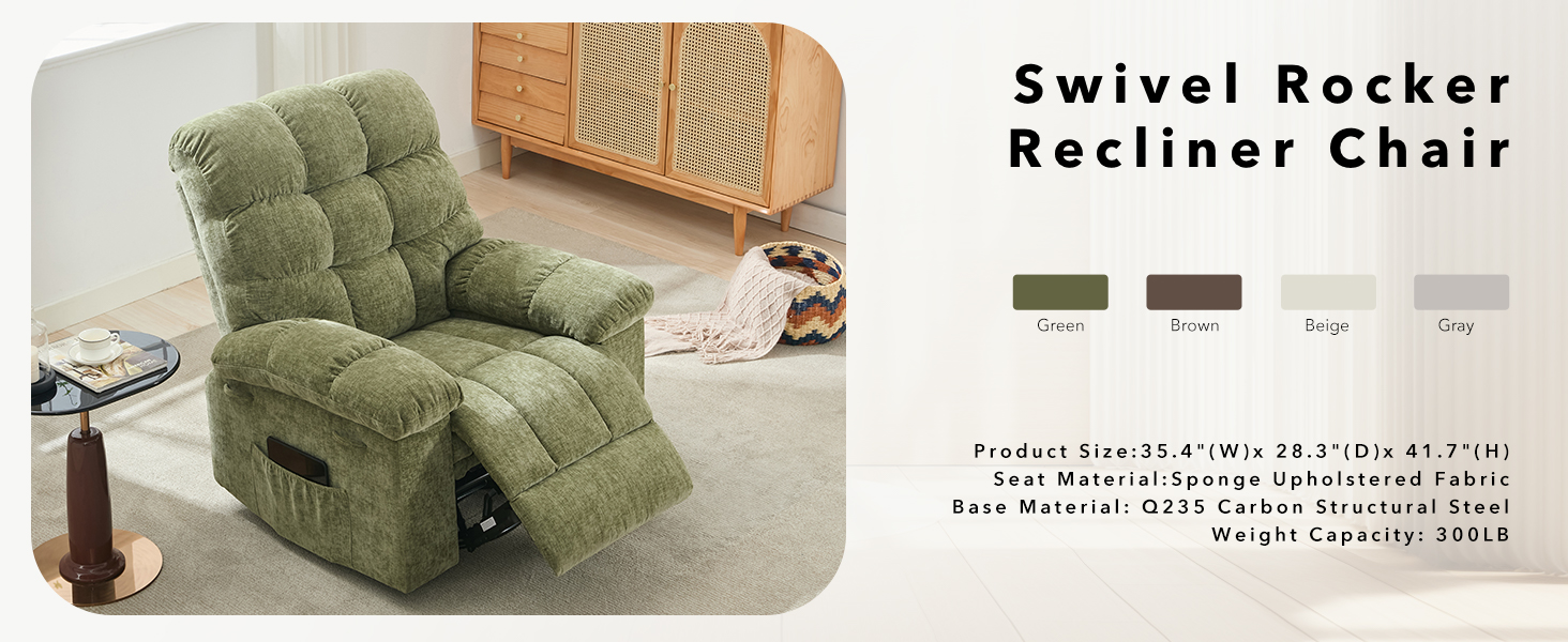 Garvee Rocking Recliner Chair, 360° Swivel Rocker Chair for Living Room, Upholstered Fabric Nursery Chair with Side Pockets for Small Spaces, q235 Steel Frame Lazy Boy Recliner Single Sofa, Green