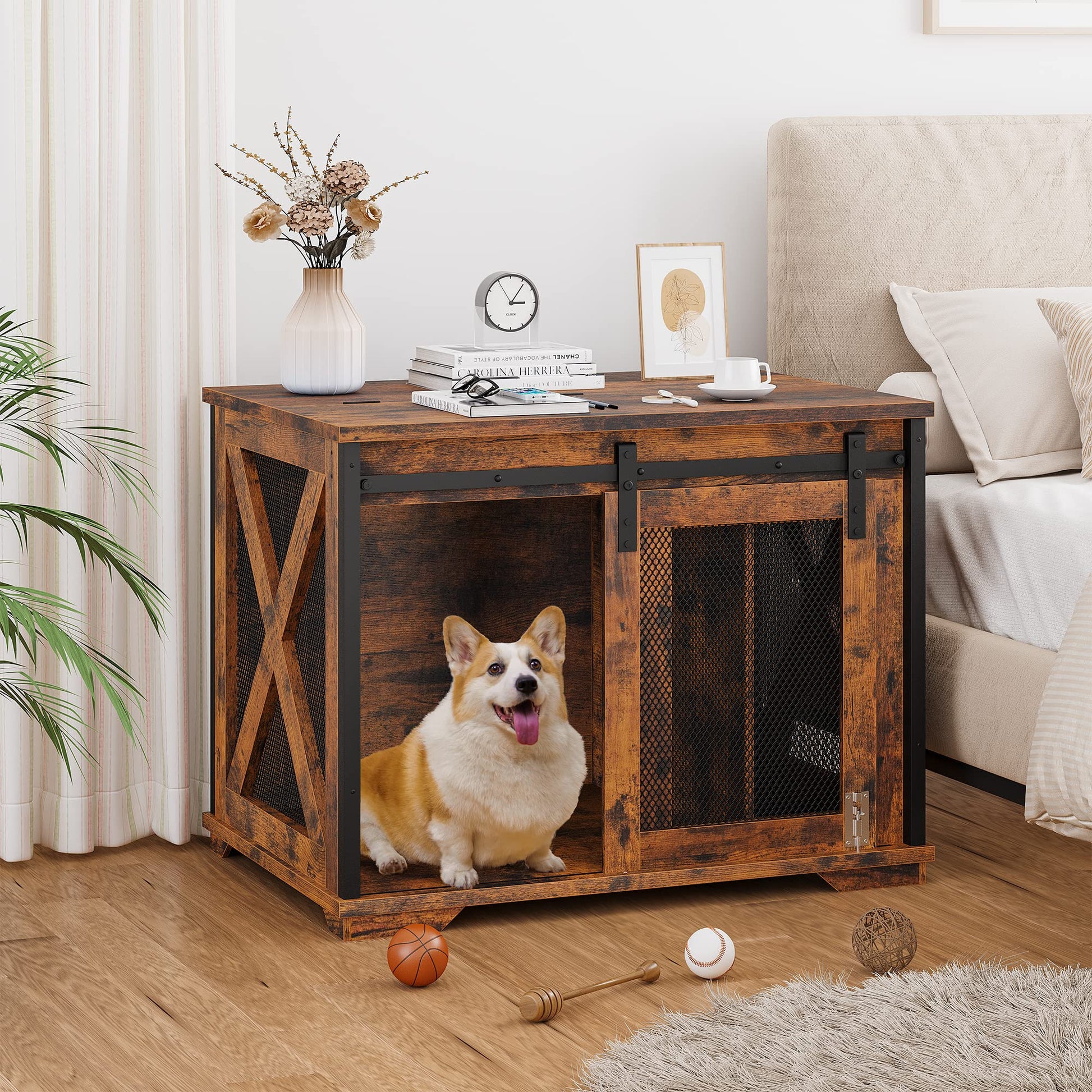 Garvee 37'' Dog Crate Furniture Side End Table with Flip Top and Movable Divider, Wooden Dog Crate Table Large, Style Dog Kennel Side End Table - Rustic Brown