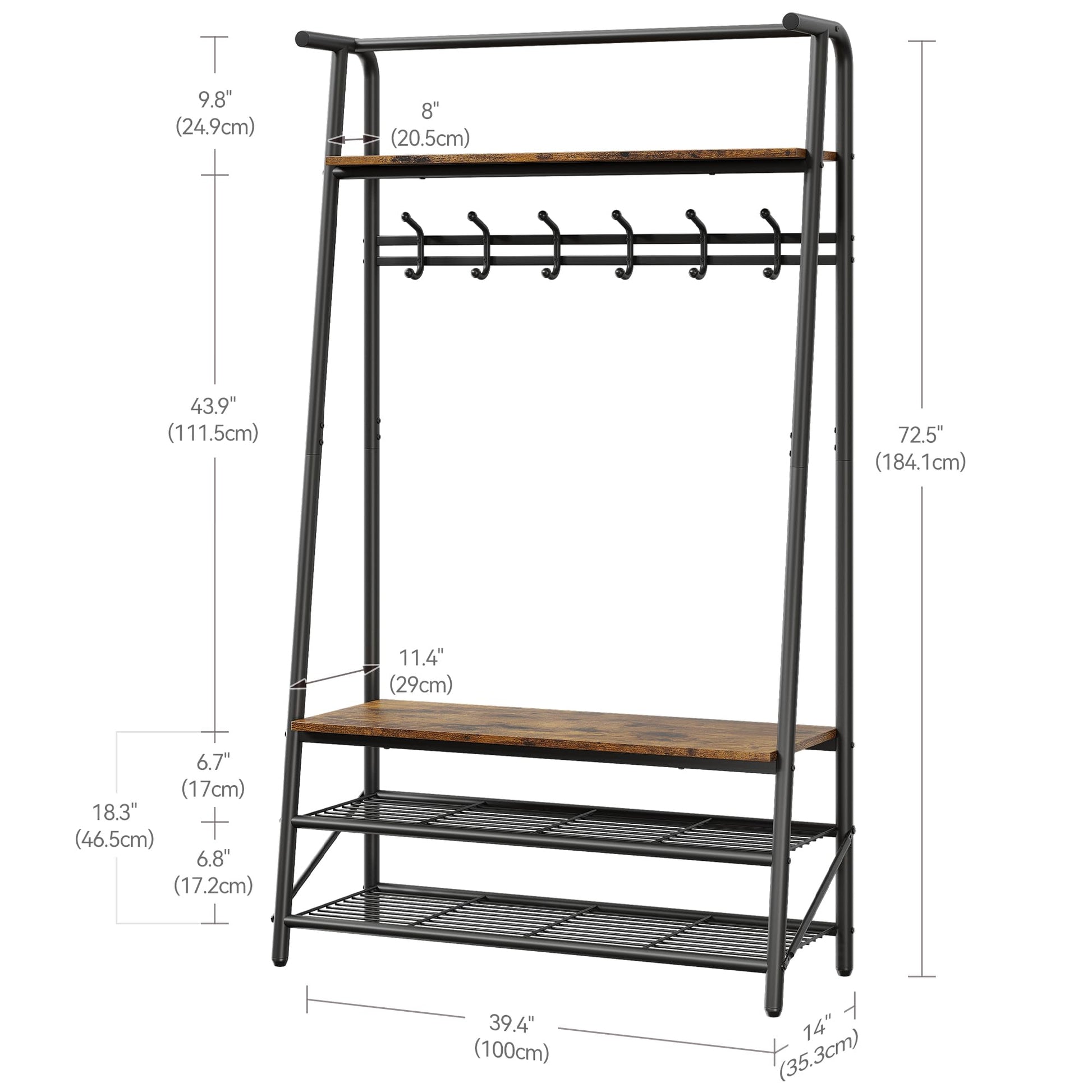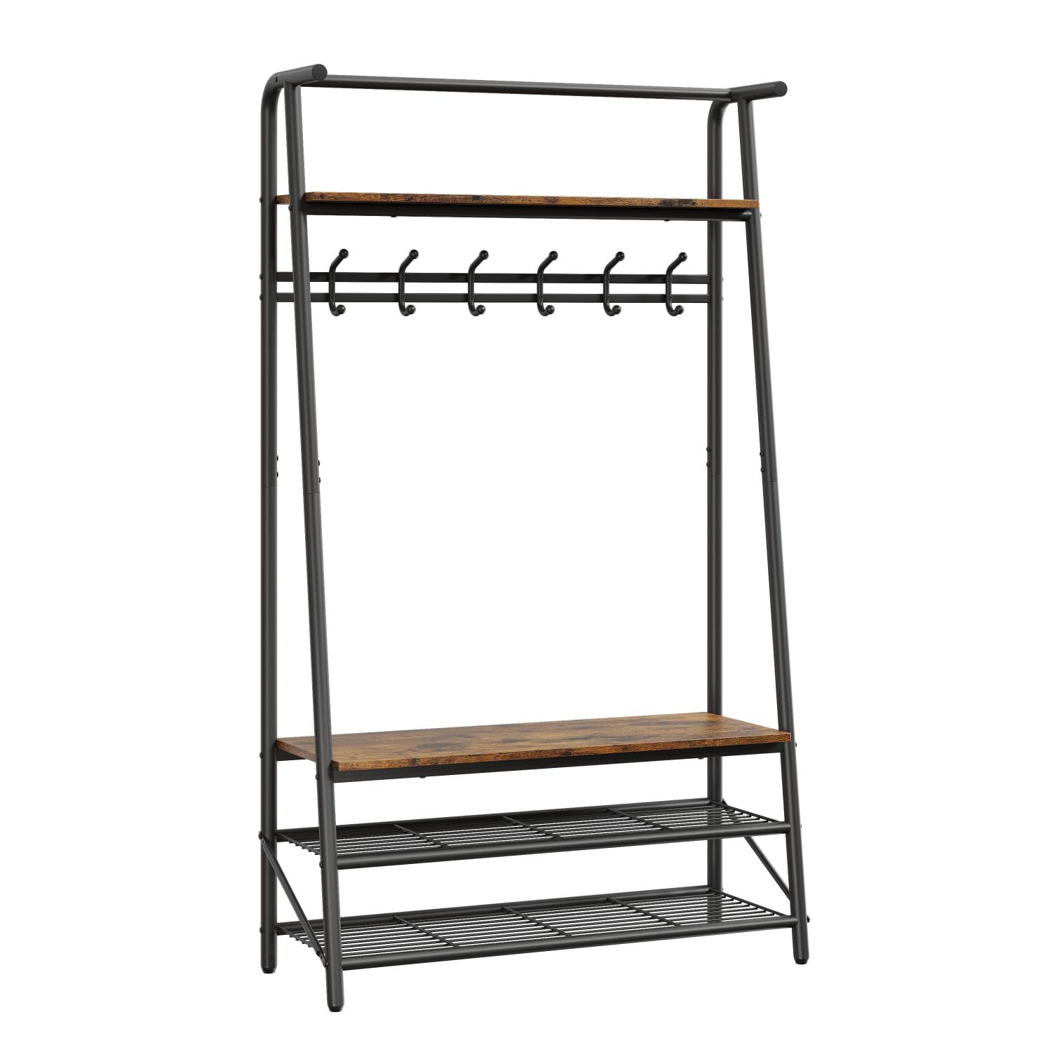 Features 6 C-shaped hooks and a top bar for hanging items, plus a shoe rack and shelf for additional storage options.