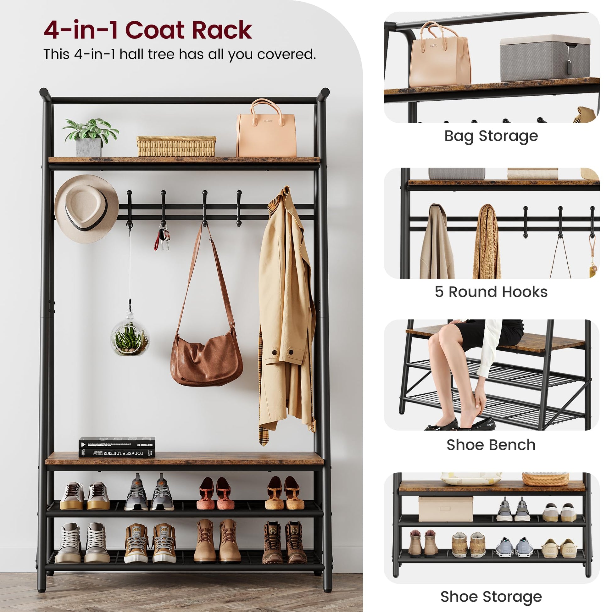 - 4-in-1 design with top shelf, shoe rack, coat hooks, and bench