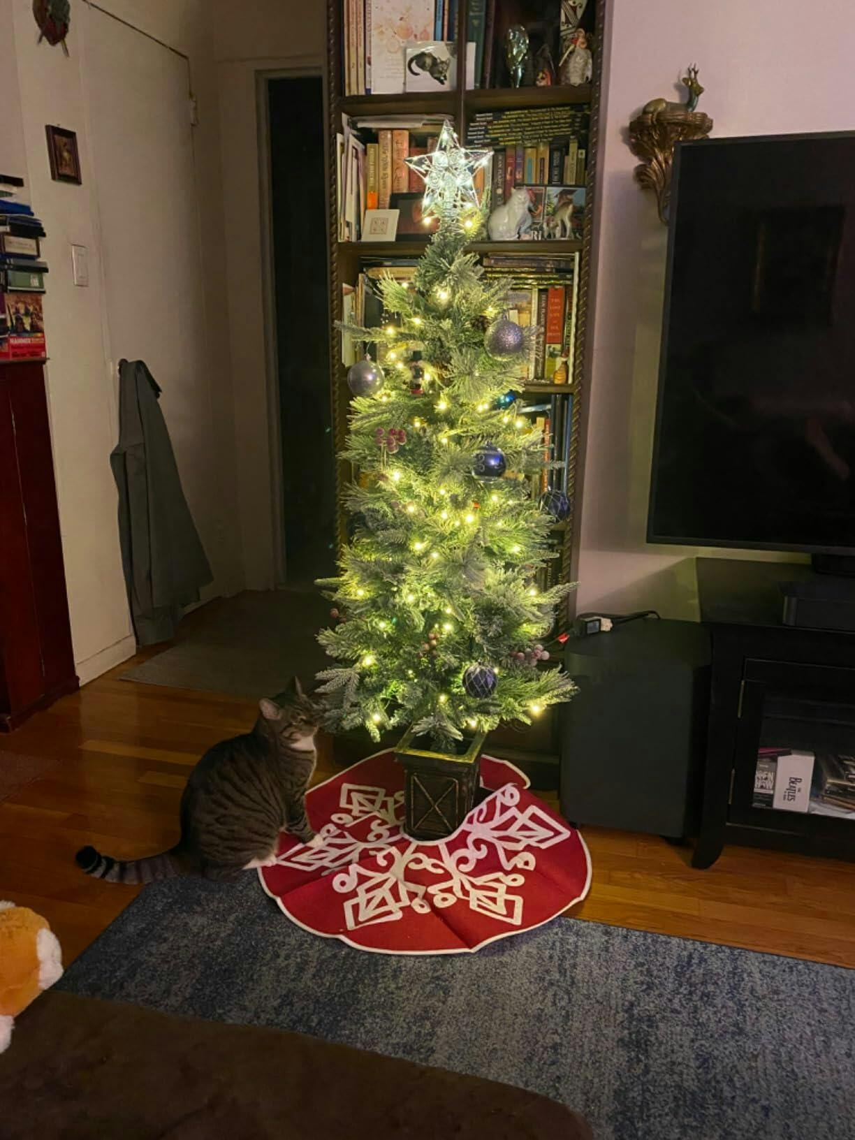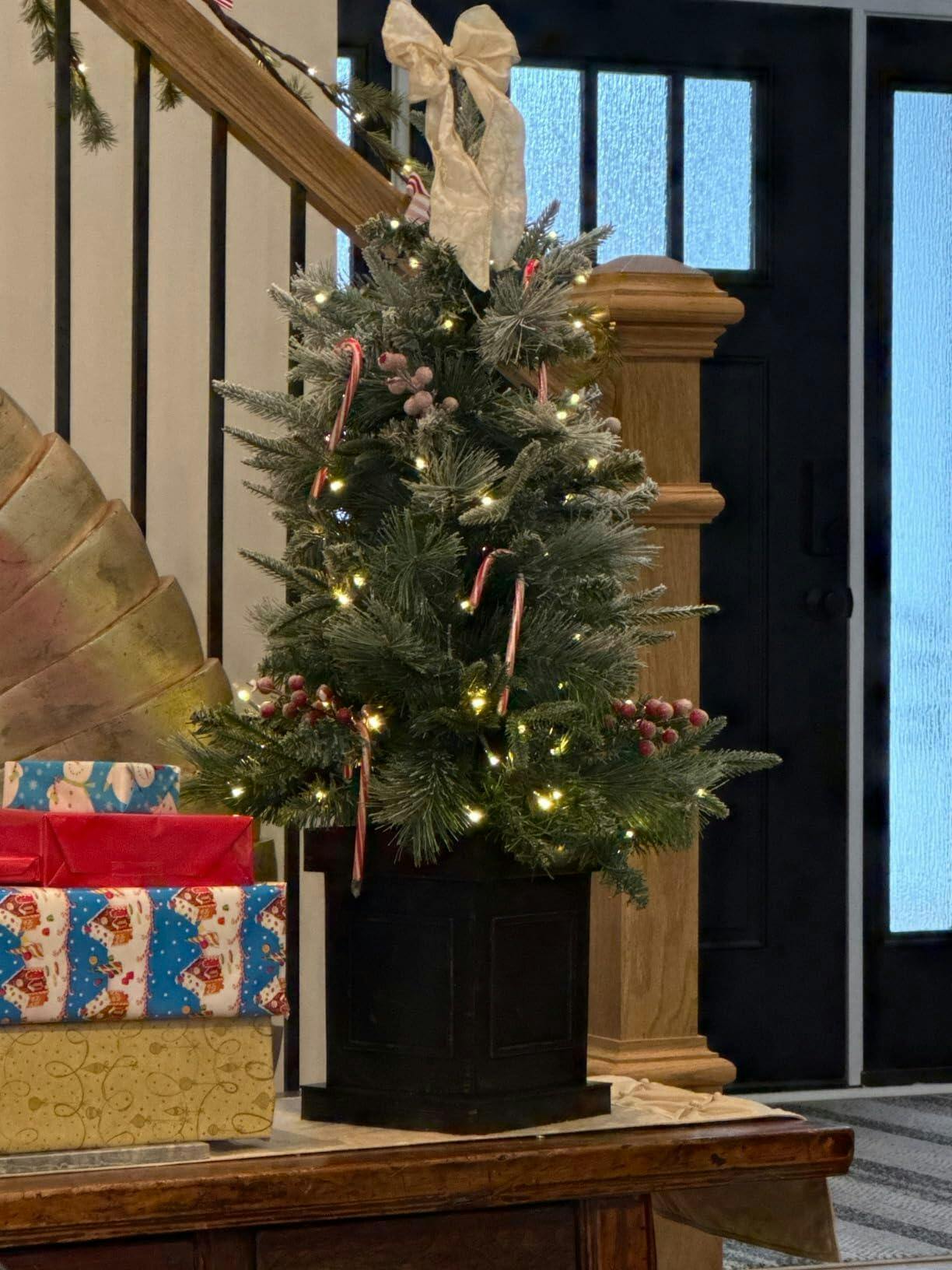 Super pretty mini tree with several different light settings. You don't need a plug since this runs on 3 AA batteries, and it's easy to tuck the battery pack out of sight. The branches are posable and sturdy so they won't break or snap off easily.