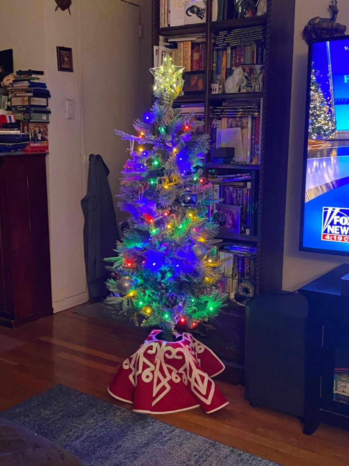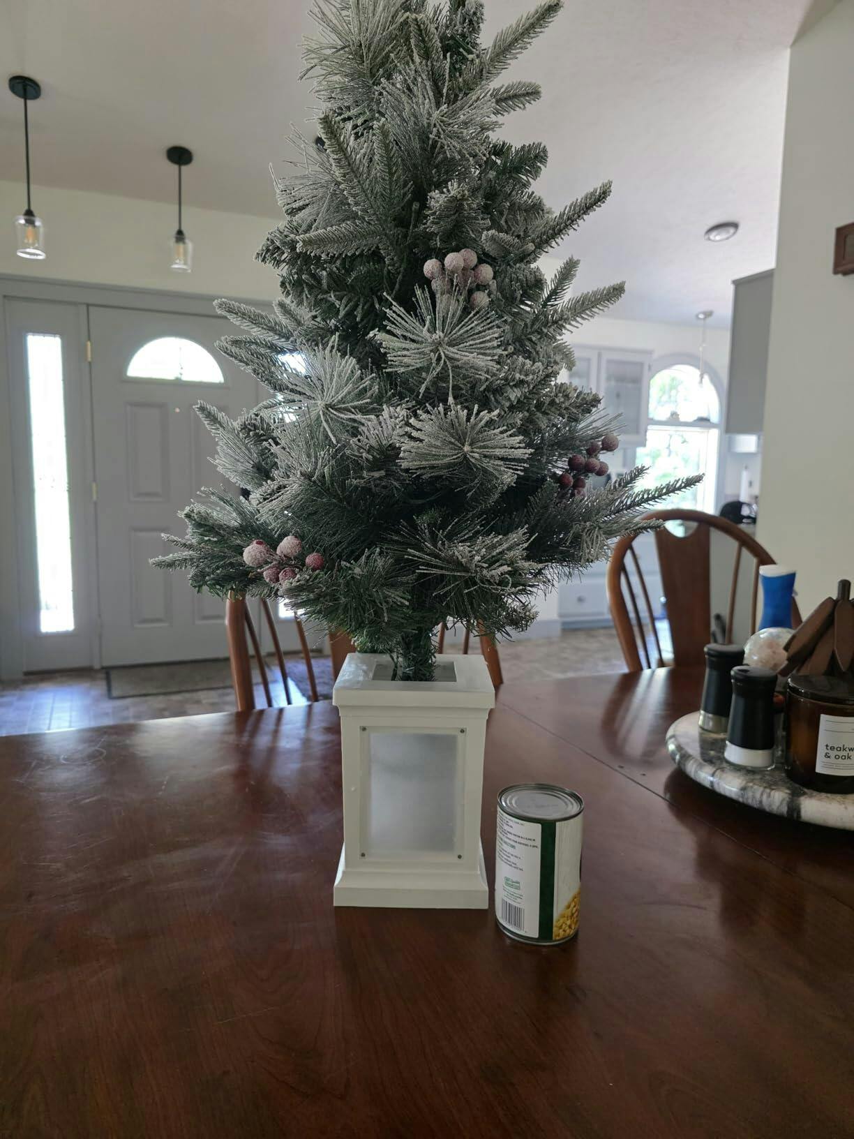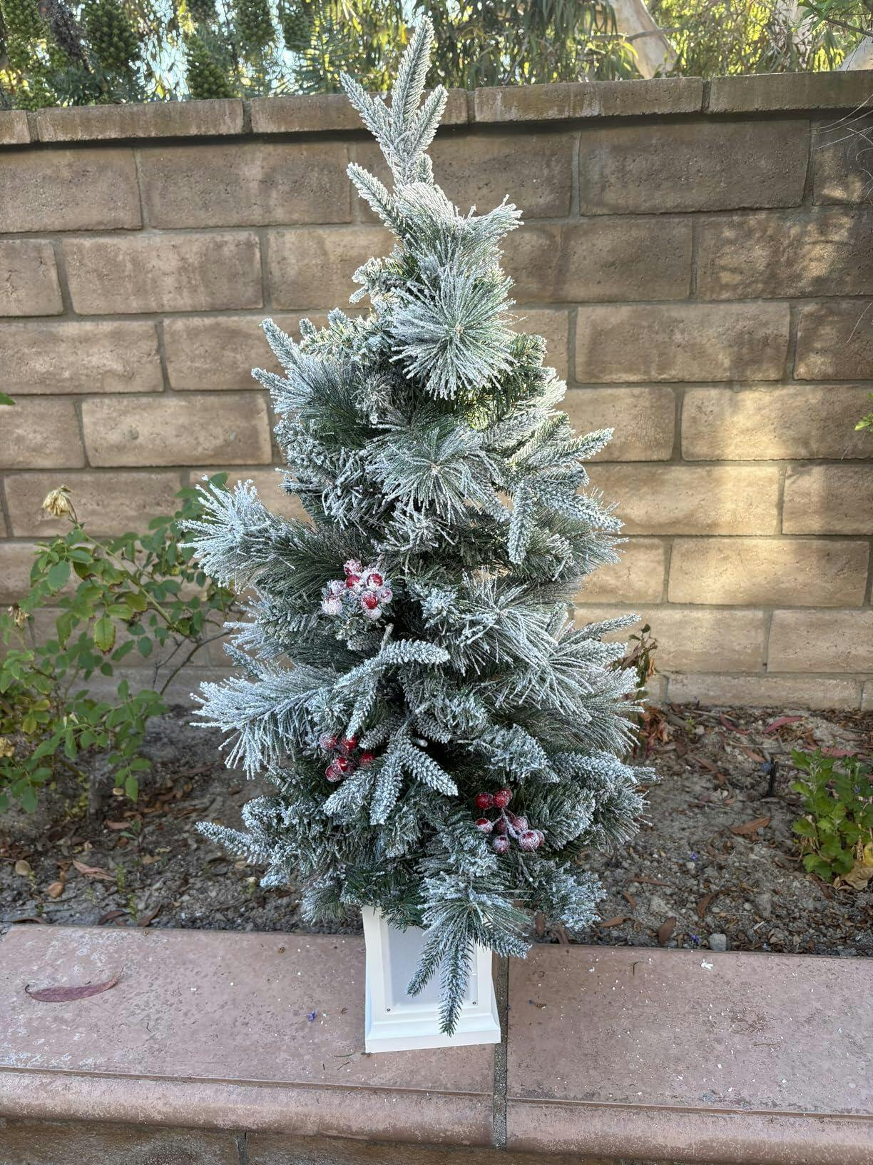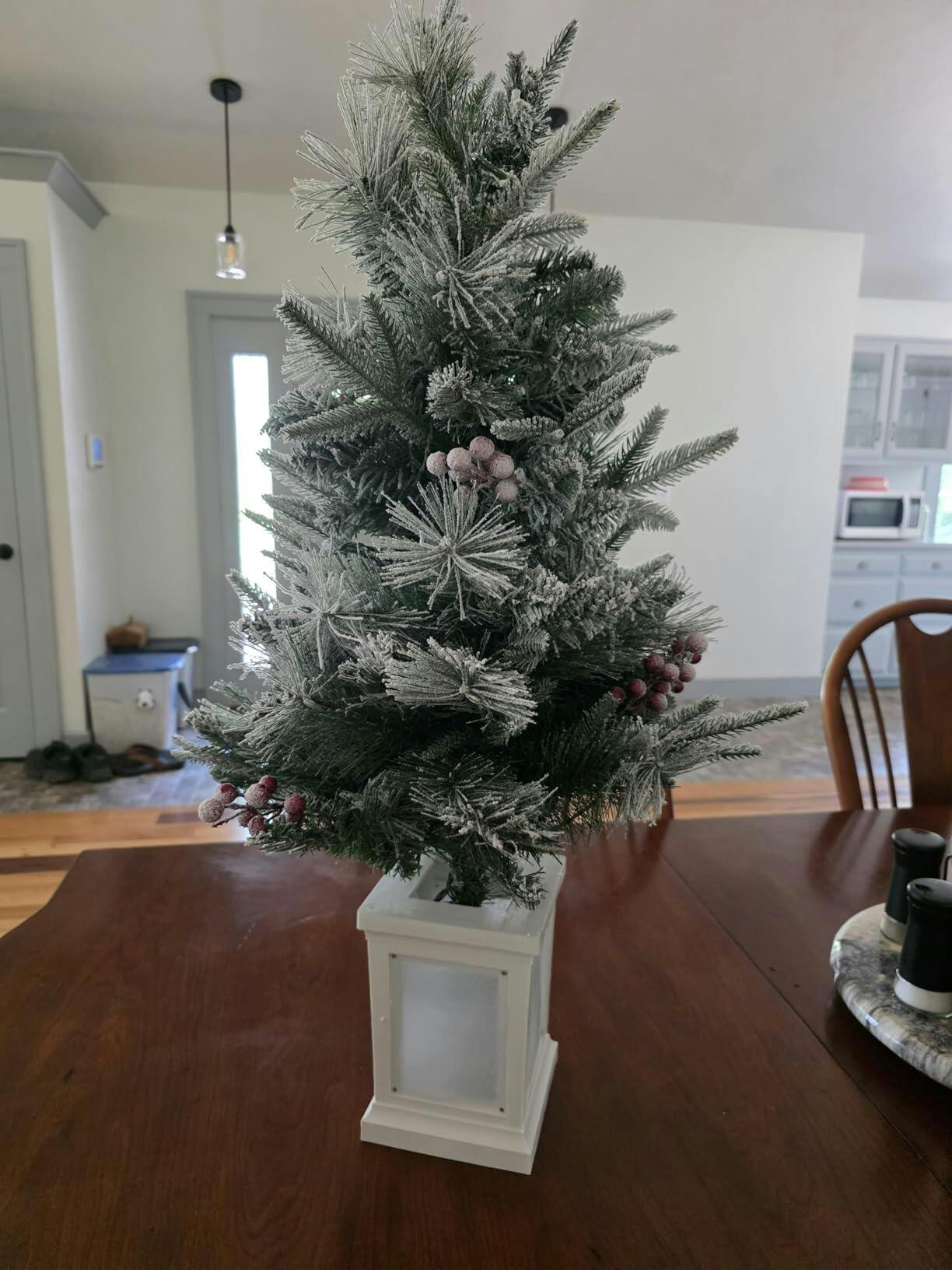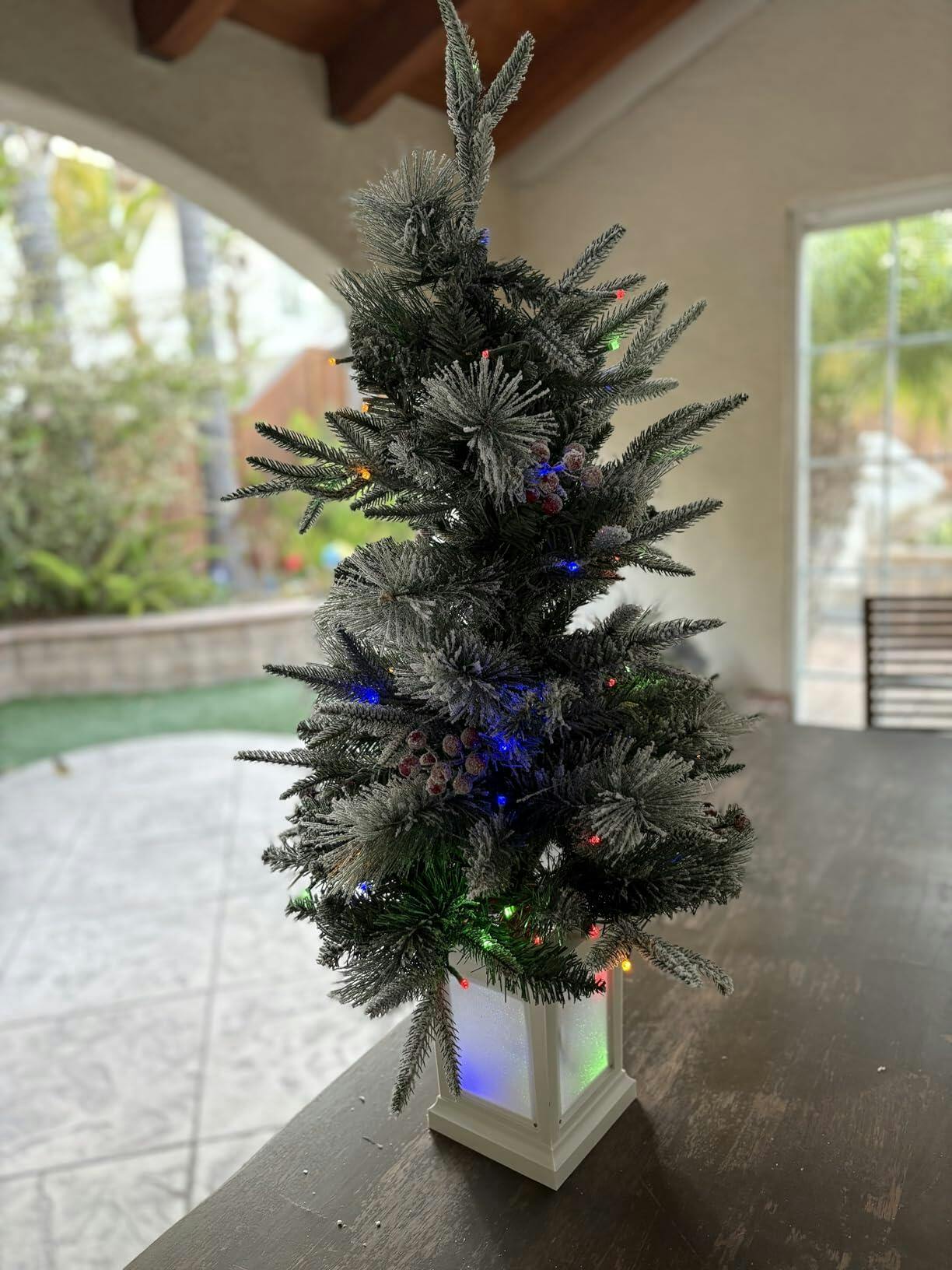 I do love this little tree and it was packaged really well. It has 8 options for lights (9th option is off) and pretty easy to turn on and off. Takes 3 double A batteries.I took a picture in the day and at sunset with the lights on. I plan to decorate it more with holiday ornaments but you don’t really need it. The tree is beautiful as is. But because it is flocked, it is messy. So I took it outside to unpack and to arrange the branches. Once it’s set up the way you want, the controller just tucks nicely inside the base. It’s steady and well made and would make a great addition to Christmas and the holidays.Like I said, my only gripe is the messy flicked white particles but that can’t be helped. Once it’s set up it doesn’t mess.1. I love the options of different light changing modes.2. The size (3 ft) is just the right size for table tops3. You can add or keep as is on decorations.4. I love that I don’t have to plug it in.Also it’s nice to note that the box it came in is a great storage box for it when you need to pack it up until next season.
