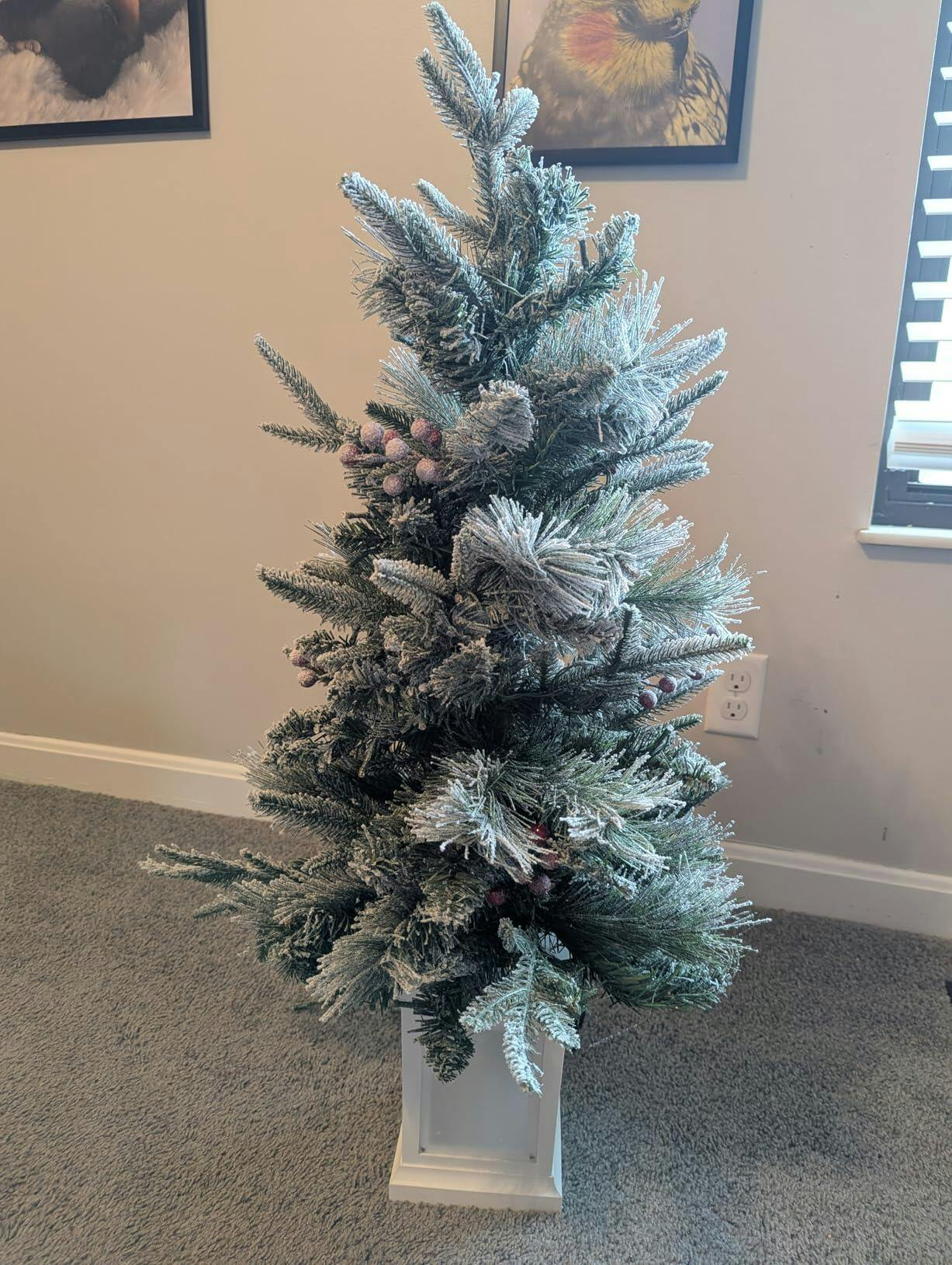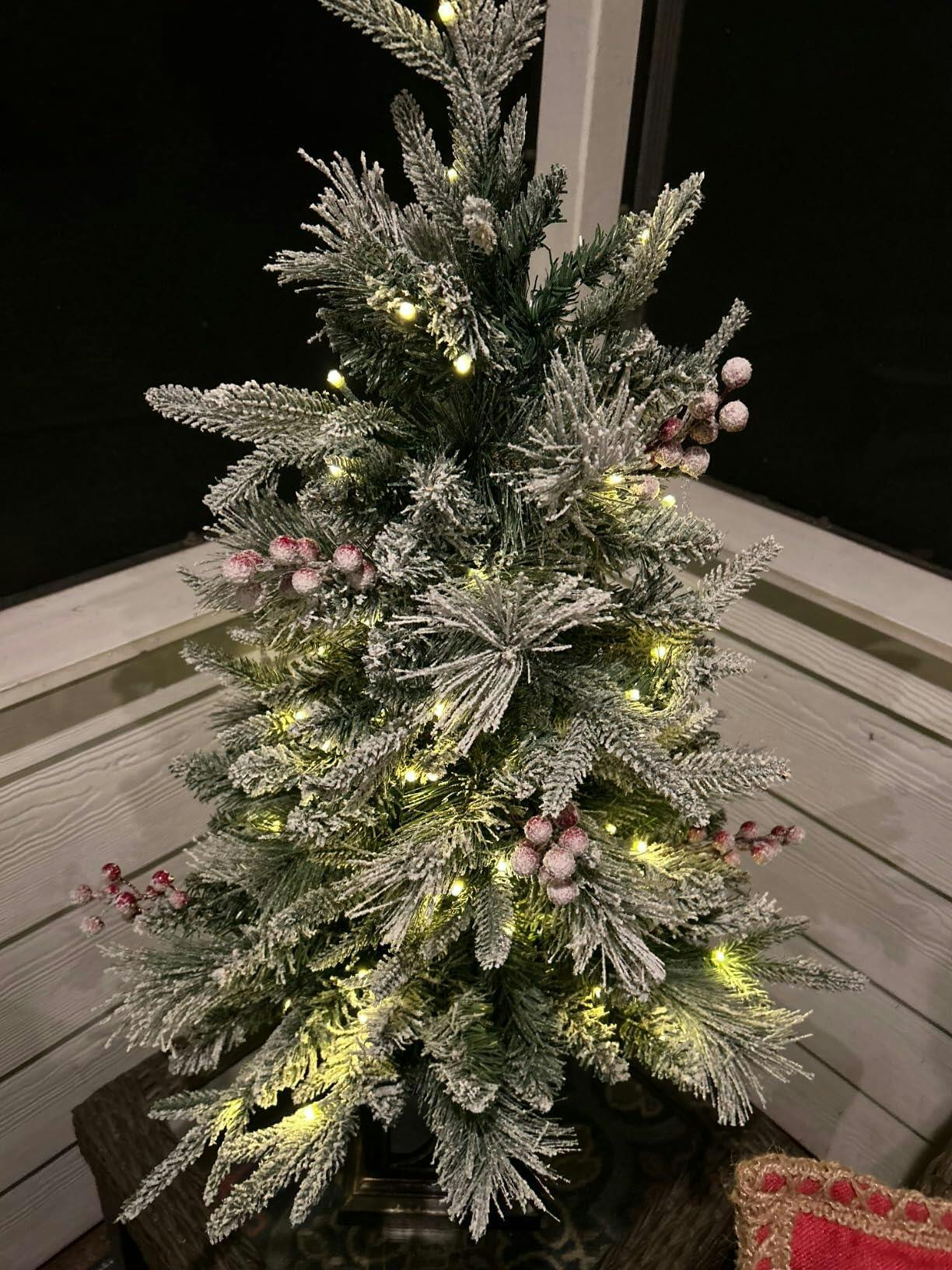 I have always wanted a smaller Christmas tree for my bedroom and this 3 ft pre lit tree is just what I was looking for. The tree comes in its own box and is ready to just be pulled out of the box and set up on a table to light up any room for the holidays. I love the added little berries and flocked branches that add a sense of realism to the tree. The lights are beautiful when turned on and with 78 independent lights if one goes out the tree will continue working. Looks gorgeous in my bedroom and really makes my room feel more included in all the Christmas festivities. There is a timer that can control the lights and they do run off of 3 AA batteries so this tree can basically go anywhere as it doesn't require an outlet. It is a little pricey for a 3 ft tree but in my opinion it is worth the price for a better looking tree that looks so high quality.