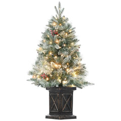 Combining classic design with modern convenience, this tree features flocked snow branches, warm LED lighting, and a charming vintage base that adds character to your holiday decor.