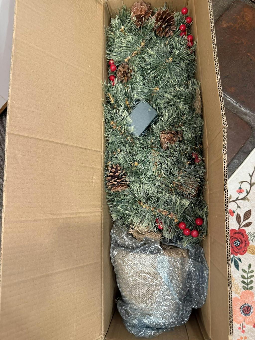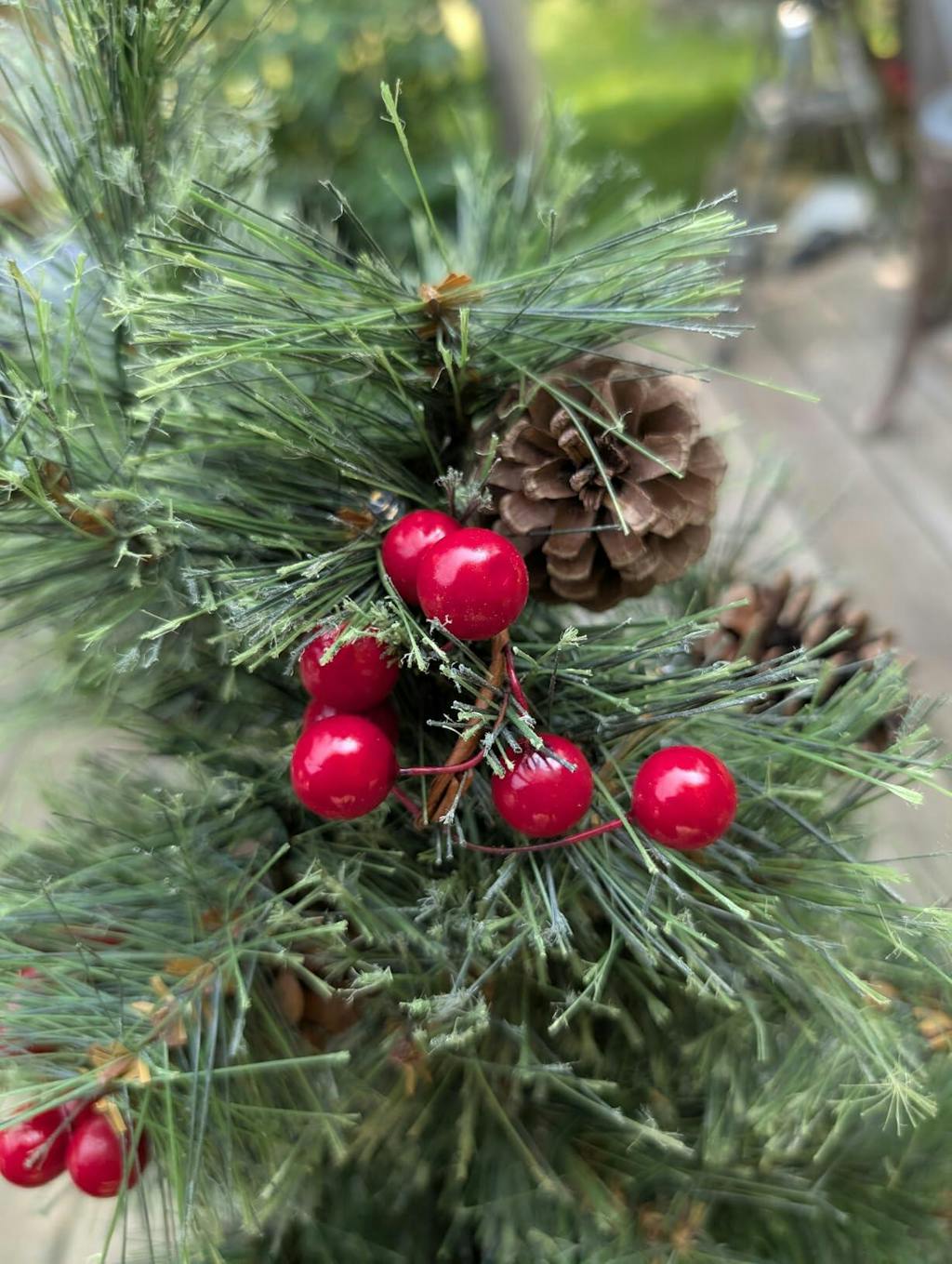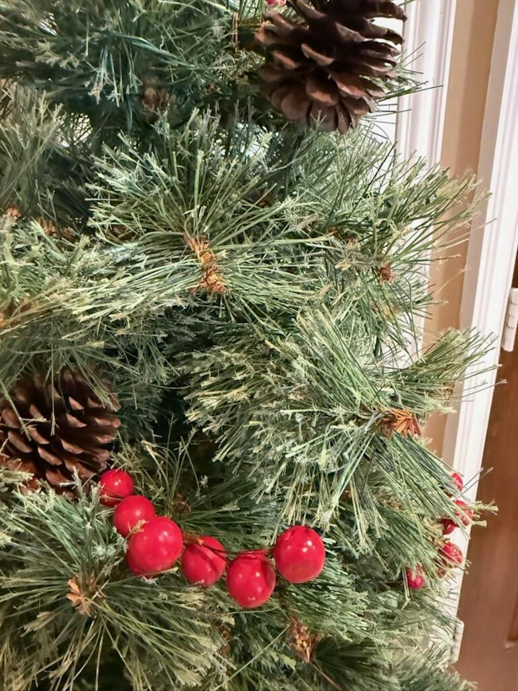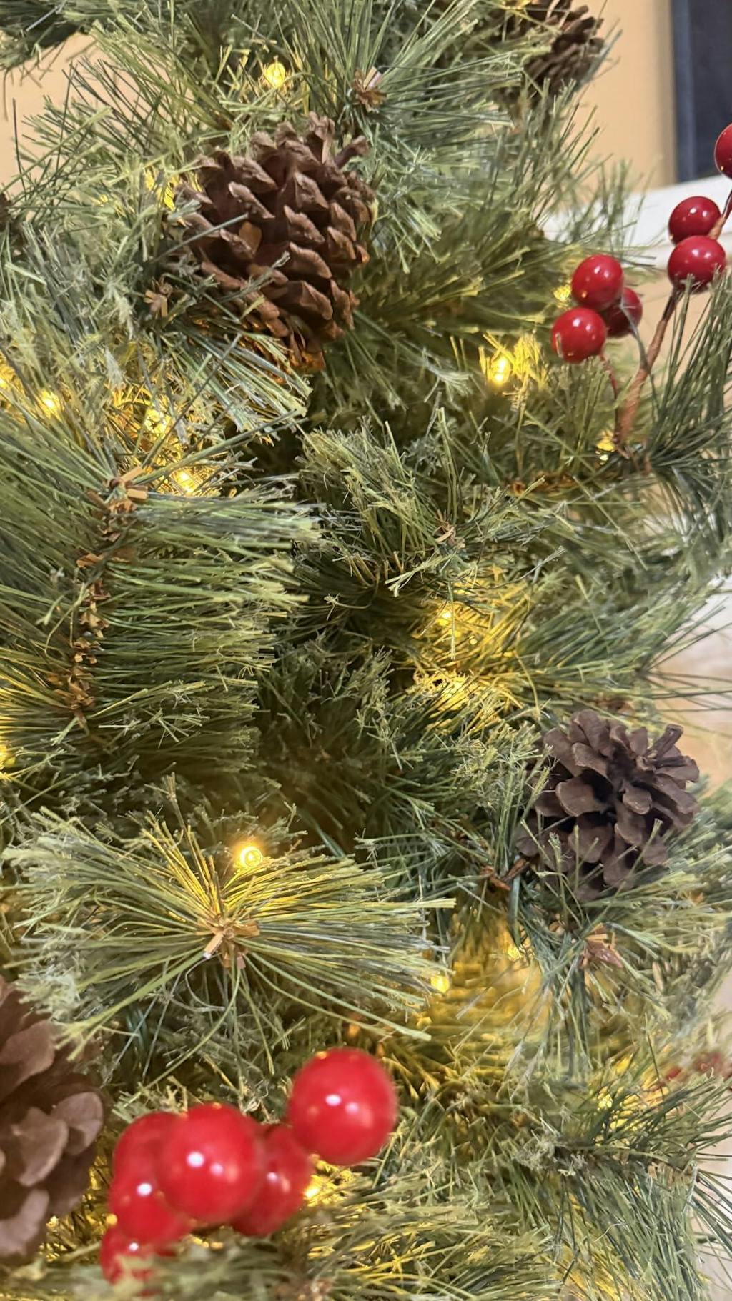 - Decorated with natural pine cones and red berries