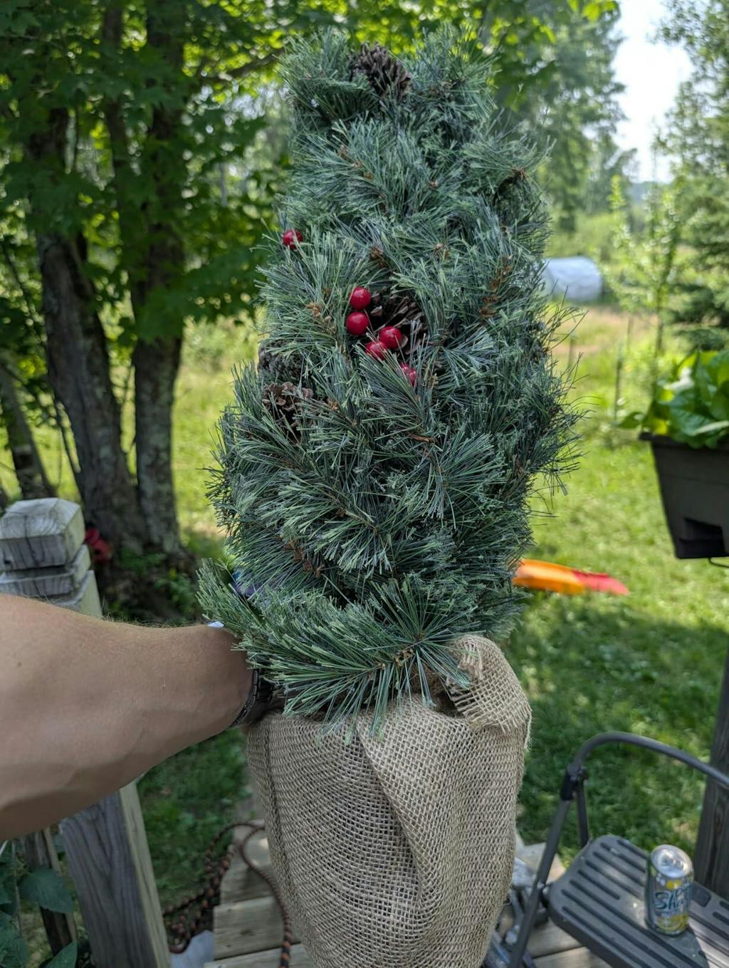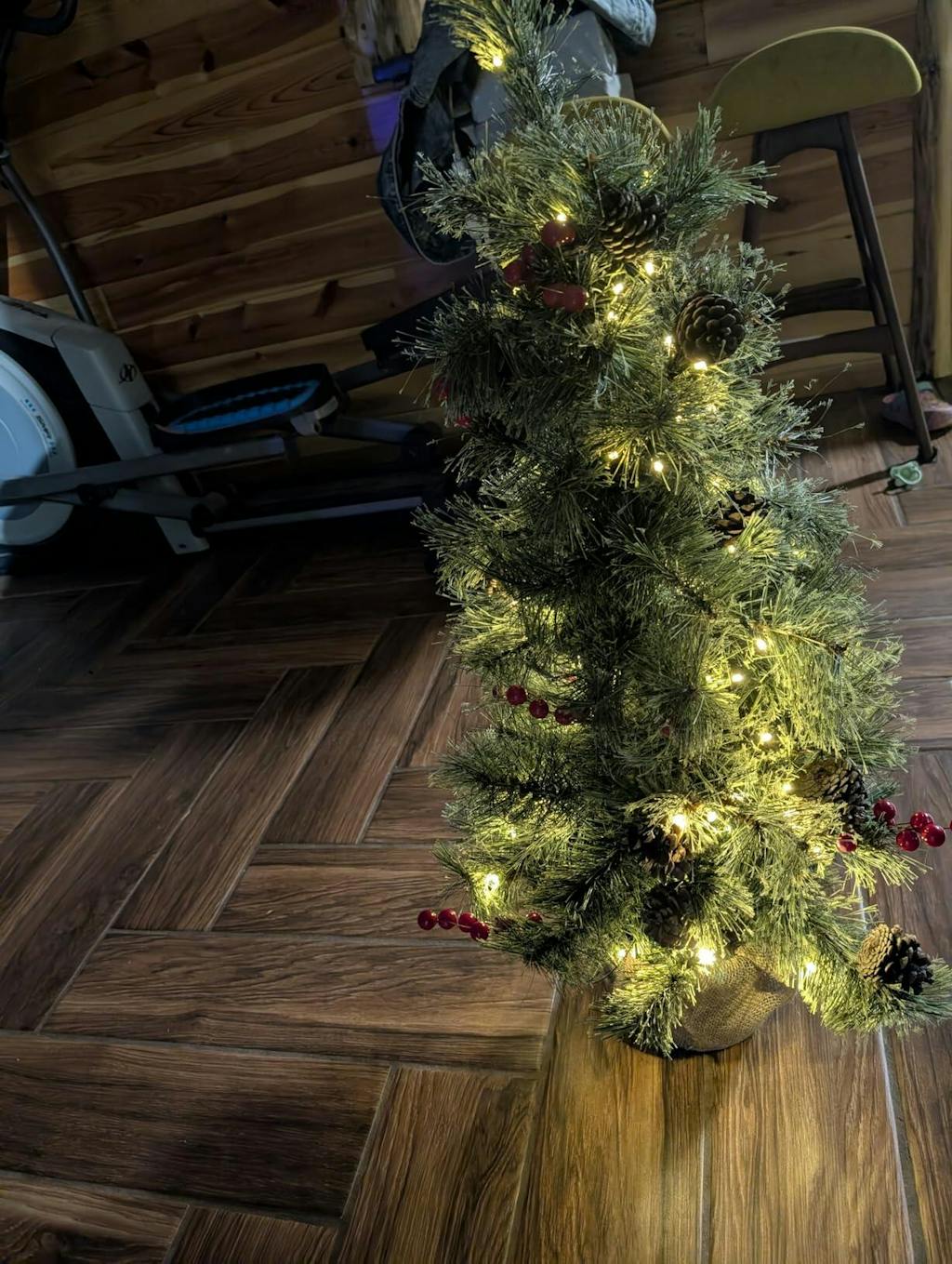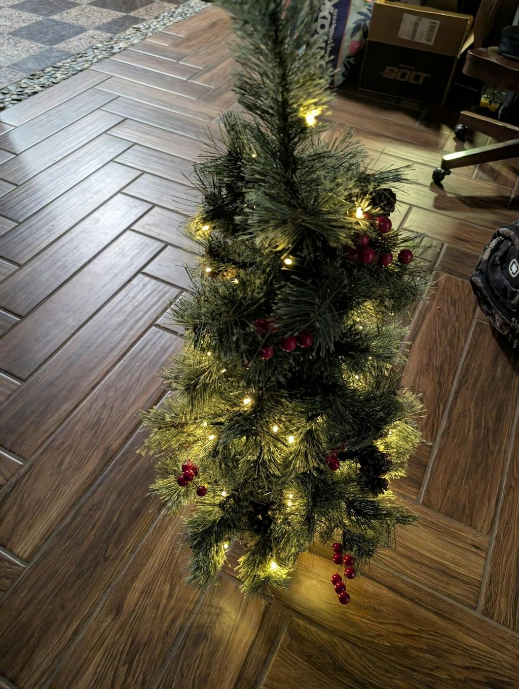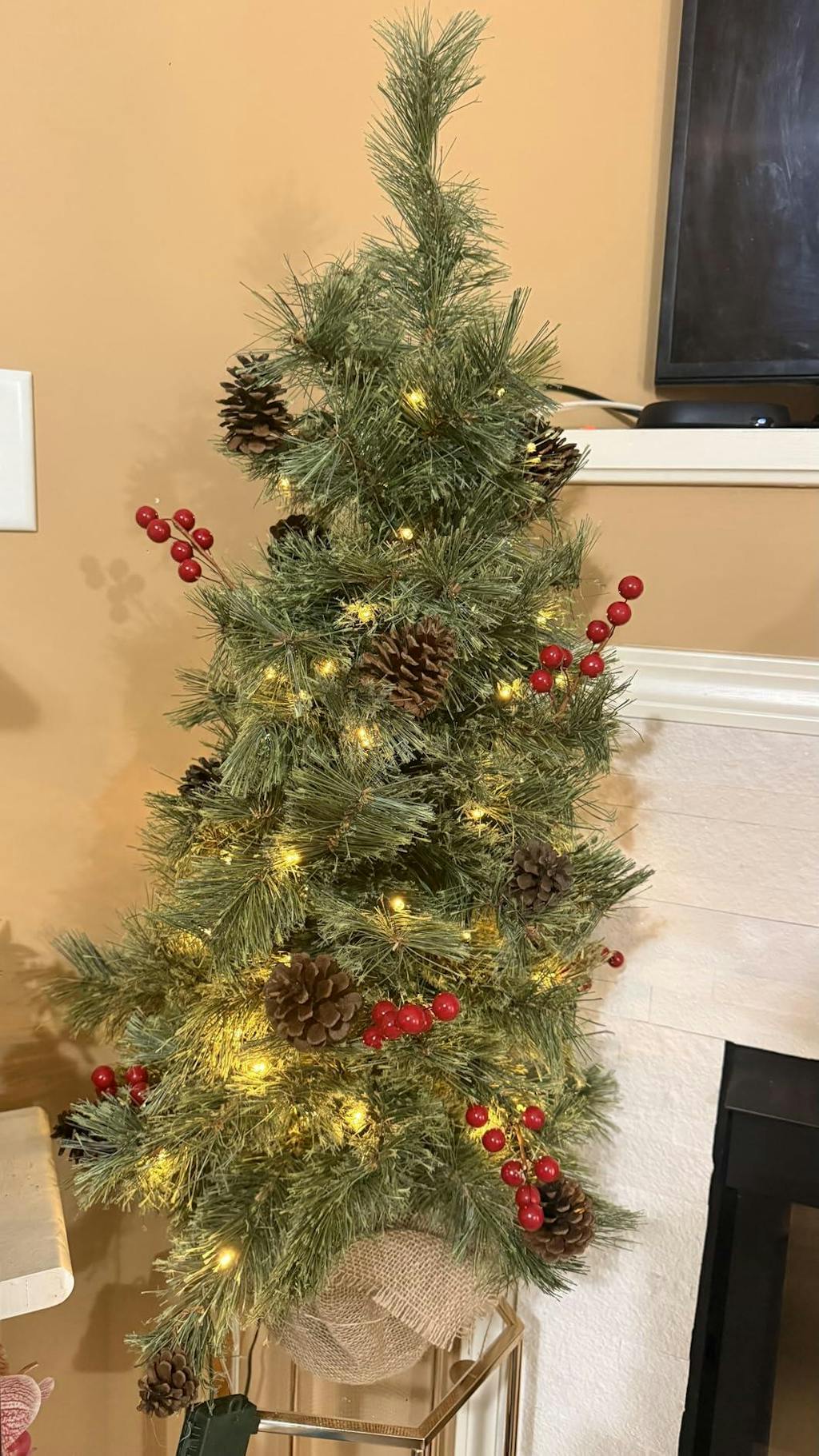 - Decorated with natural pine cones and red berries