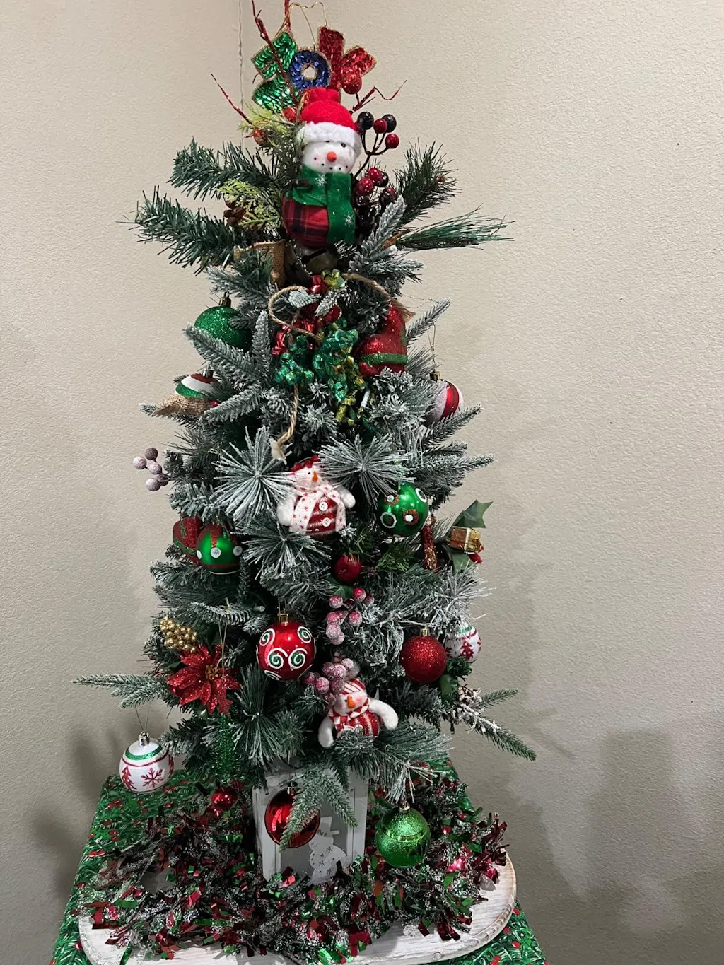 | Features | Snow Flocked, Pine Cones, Red Berries, Snowman Base, 8 Light Modes |