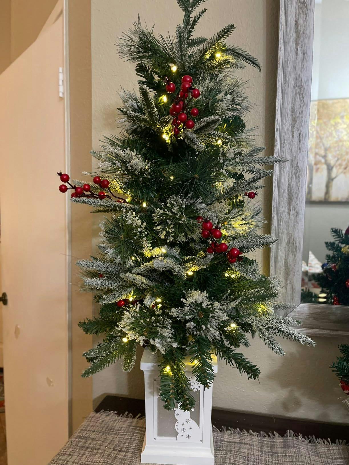 This tree arrived in three days and literally the set up was take out of the box fluff off the branches put in the batteries and that was it. I did buy some extra mini Christmas balls to add to it but really if you just wanna fluff off the trees branches Because it already comes with a little bit of red holly you can easily do thatThe only negative thing if you can even call it a negative is that it sheds a lot of the little white fake snow that it has on it but I set it up over some plastic because I had read that in some of the other reviews and it really wasn’t all that much just you know enough to have to clean up obviously This is an awesome pretty little tree that has a beautiful base so you don’t even have to get a skirt the lights are pretty good and it’s excellent for a small space. I bought it for my mom who is elderly and my brother who is going through some health problems. I really couldn’t get out a big tree fit perfectly on their little area, coffee table !!! it literally took me 25 minutes to set it up, and that was because I put extra ornaments on it otherwise it probably would’ve just taken me 10 minutes I like that the lights are battery operated so you can set it up anywhere and it has different mode so you can have the lights flashing or strobe or just a steady glow, I love the base that also is lit and has a little snowman on itI think it’s a good value