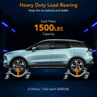 With a 6000lbs loading capacity (1500lbs for each dolly), these dollies are versatile and great for moving cars, trucks, trailers, boats, tractors, ATVs, motorcycles, airplanes, and more in shops, garages, and showrooms.