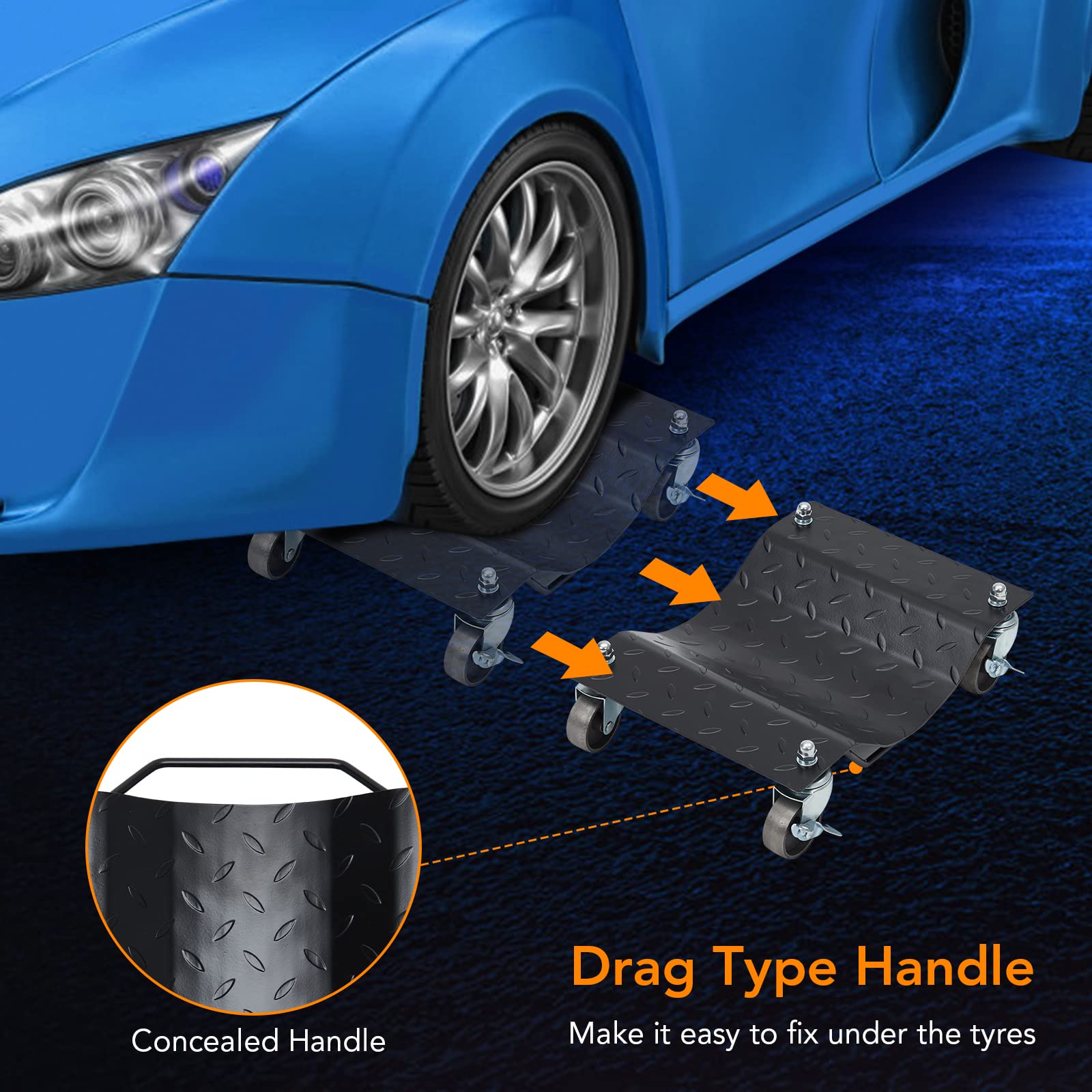Each tire skate features a convenient handle on the side for easy lifting and carrying, allowing you to move the car dolly by the handle or its wheels. Ergonomically designed for maximum comfort during use.