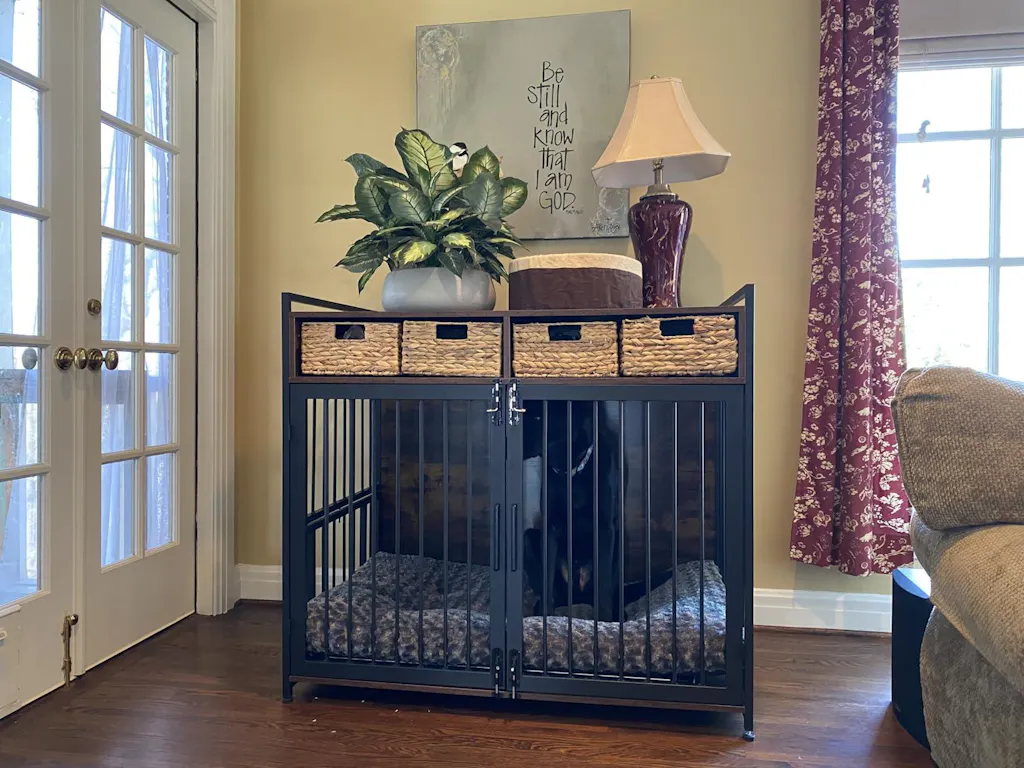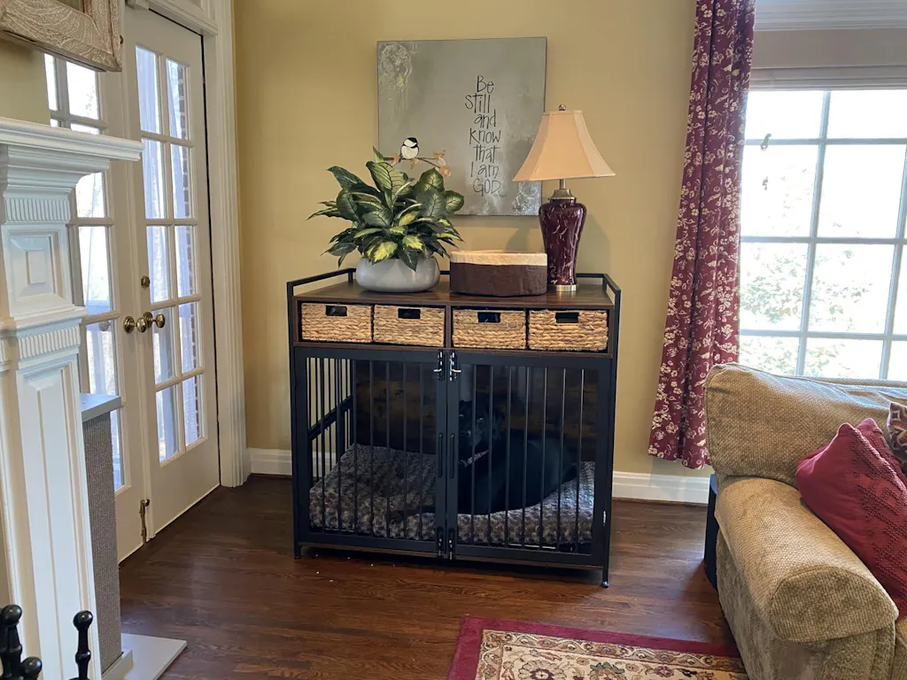 - 【Multi-Functional Dog Crate & Stylish Furniture】This dog crate seamlessly blends practicality with home decor. It provides a safe, cozy retreat for your pet while doubling as a stylish side table, coffee table, or bedside table. The spacious top surface is perfect for displaying plants, photo frames, or storing pet essentials, adding both function and flair to your living space.
