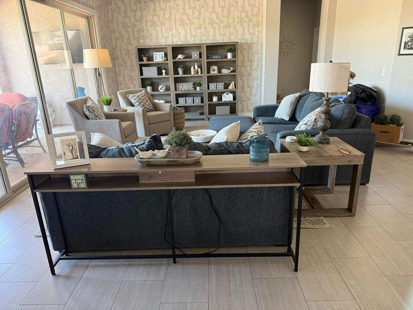 Adds rustic charm with a unique top design and wood grain surfaces.