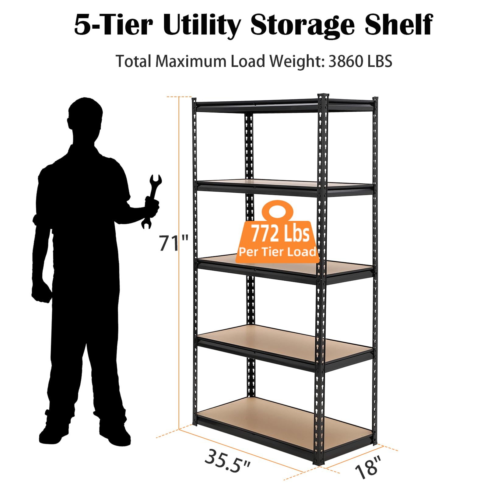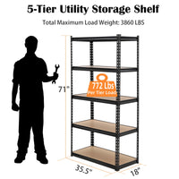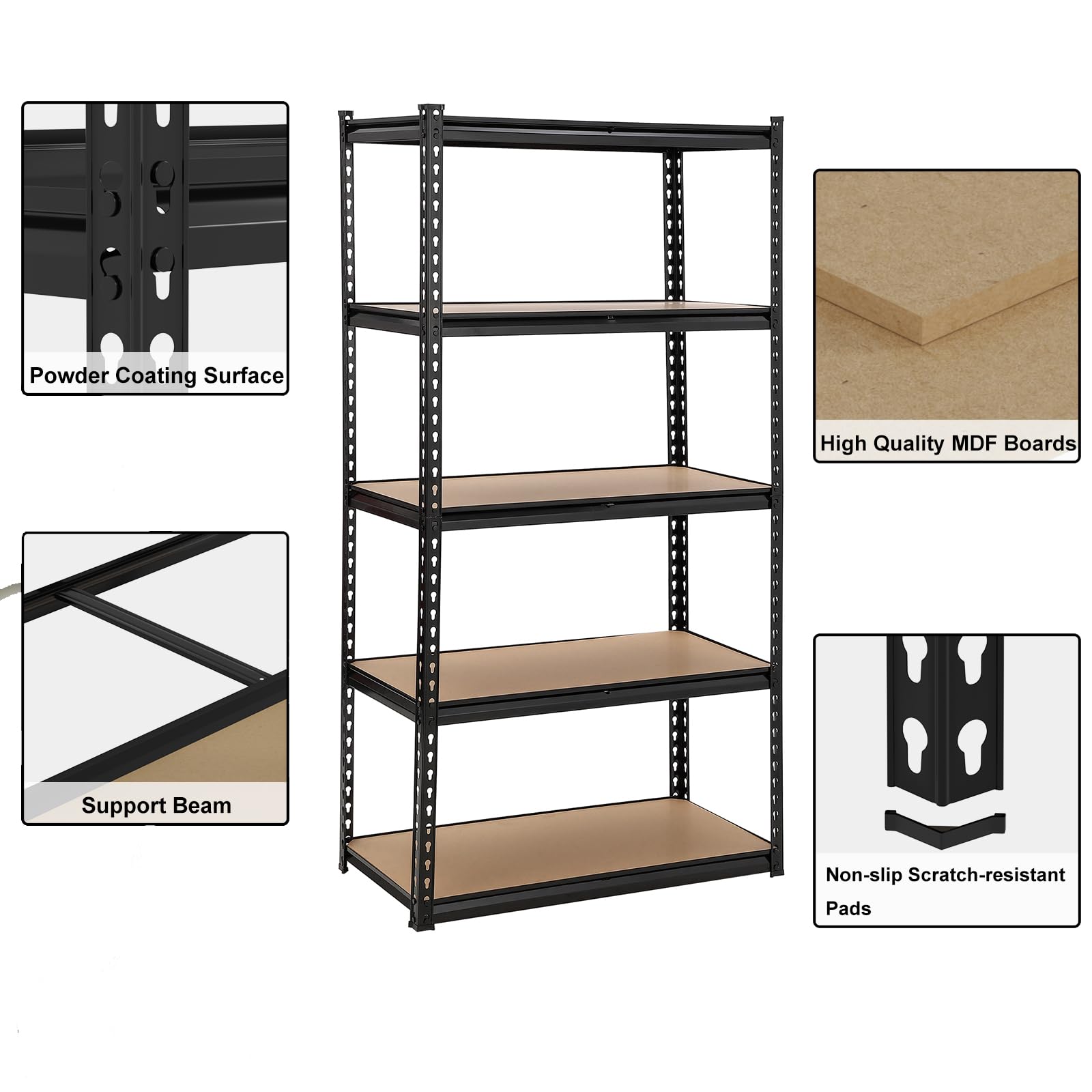 - --Sturdy Construction: Built with a 0.04 inch metal frame and 0.2 inch thick engineered wood, these 5-tier shelves offer exceptional durability. Each shelf supports up to 772 lbs. The powder-coated surface is water-proof, anti-resistant and anti-corrosion.