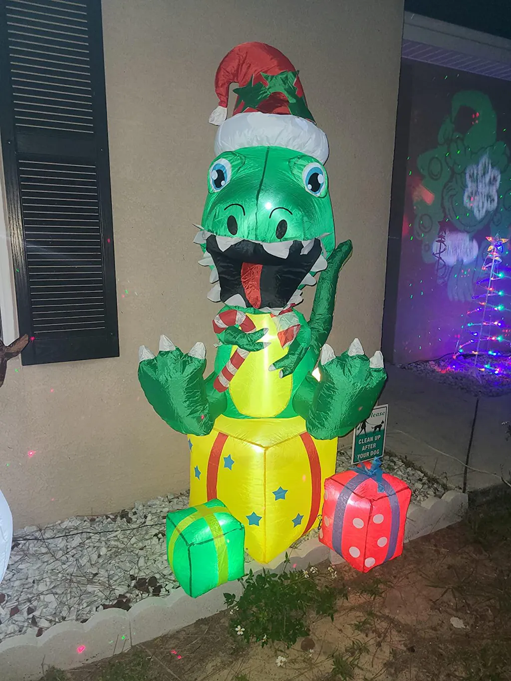 - Unique & Interesting Design - A cute baby t-rex in a Santa hat sits on a big gift box with two small gift boxes scattered around his feet, totaling 5 ft tall. Get it to inject the Christmas spirit and create a strong Christmas atmosphere around your house and yard. The built-in LED lights add more Christmas spirit to your yard when lit up, making your yard fun during the Christmas season.