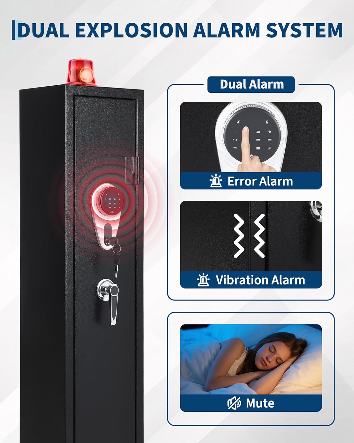 - 🛠【Programmable Electronic Lock & Emergency Access】Gun safe for rifles is equipped with a digital keypad, this safe supports 3–8 digit codes and allows two unique user passwords for controlled access. In case of battery failure, use the override keys or external battery pack to maintain entry. Requires 4x AA batteries (not included).